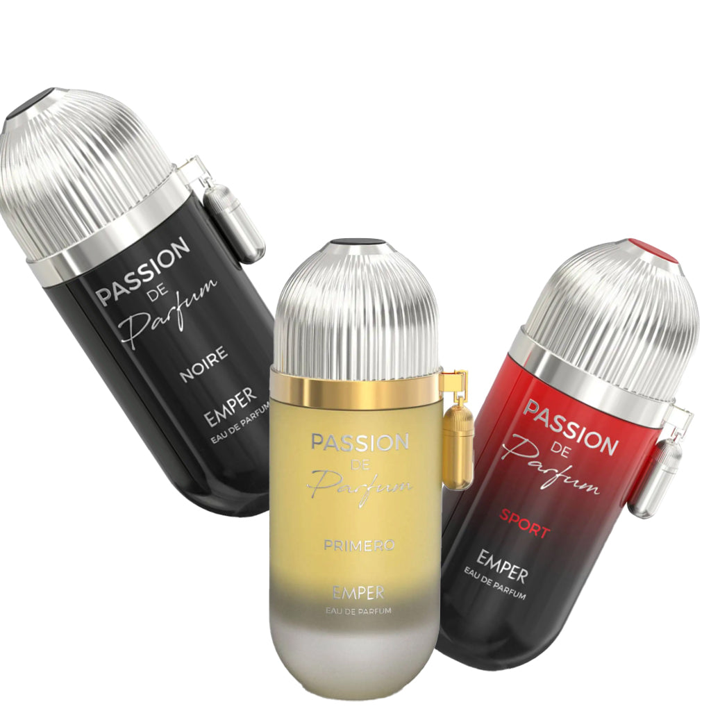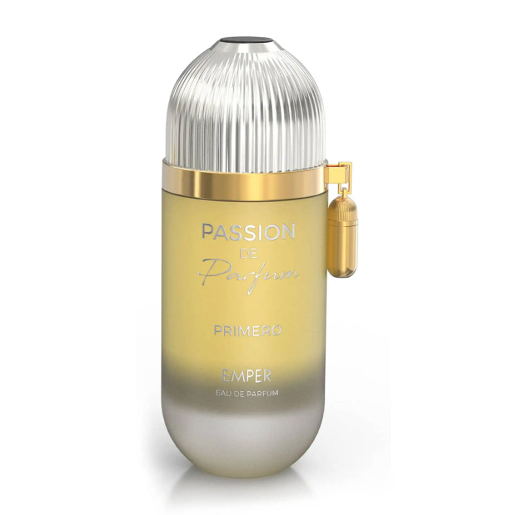 Passion De Parfum Primero commands attention with smoky woods and soft leather.A refined blend of violet, iris, and amber — bold, smooth, unforgettable. Head: Sandalwood, Leather, Papyrus Heart: Virginia Cedar, Violet Base: Cardamom, Iris, Amber