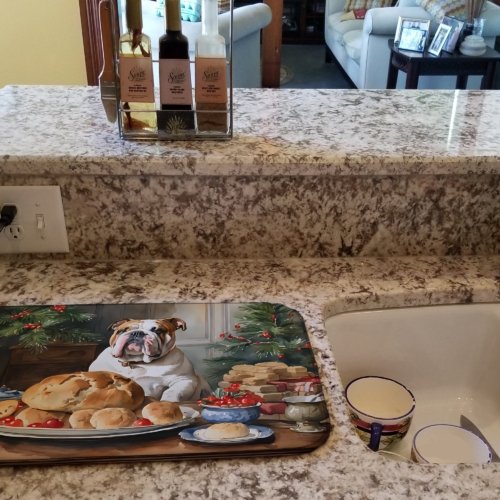 Dish Drying Mat featuring breed specific English Bulldog artwork. Celebrate Christmas with this Christmas Dish Drying Mat. Say goodbye to messy countertops and soggy dish towels with our innovative dish drying mat. Our high-quality dish drying pad is designed to keep your countertops dry while offering a stylish and efficient solution. Whether you’re air drying dishes, glasses, stemware, silverware, pots, pans, bottles, or even fruits and vegetables, our dish mat is the perfect choice. The 14 inches x 22 inches size fits most counters and dish drying racks, and the non-slip design ensures stability. Made with water-absorbent polyester and a polyurethane foam insert, our dish drying mat is not only functional but also durable. It’s machine washable and printed in the USA for long-lasting use. The beautiful artwork adds flair to your kitchen decor, making it a perfect housewarming gift or present for any occasion. Upgrade your kitchen experience with our absorbent and versatile dish drying mat.