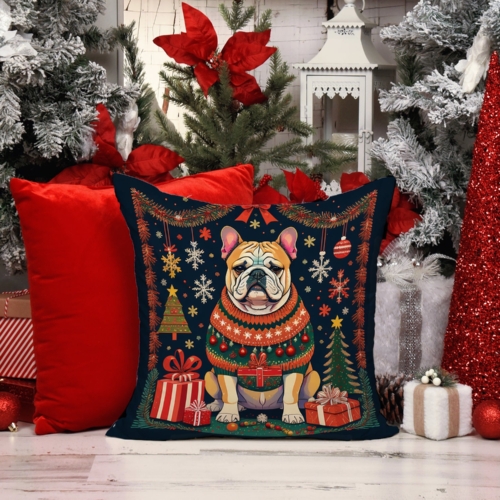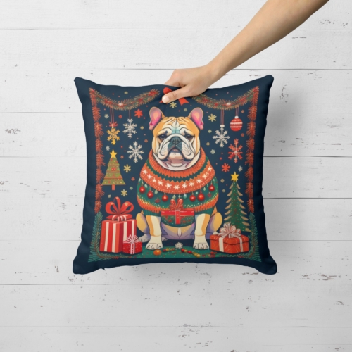 Throw Pillow featuring breed specific English Bulldog artwork. Celebrate Christmas with this Christmas Pillow. Add a touch of vibrancy and comfort to your outdoor seating with Caroline’s Treasures Fabric Decorative Pillow. Measuring approximately 14 inches by 14 inches, this outdoor pillow is crafted to elevate the appeal of your patio furniture, infusing it with vivid color and artistic flair. The pillow includes a 100% Polyester Fabric sham filled with a quality pillow form to provide superior comfort. Innovatively made from our brand new material, specifically woven for its water resistance, this pillow is designed for durability. The soft canvas fabric offers versatility in use, fit for your indoor couch or your outdoor patio, porch, or veranda. The fabric is dyed with colorfast dyes built for resilience against weather conditions, ensuring the pillow retains its beauty over time. Constructed by sewing three fabric pieces to create a sham, the polyester insert is then nestled inside to form the pillow, resulting in an overstuffed pillow that maintains its shape. Both the sham and the pillow insert are proudly made in the United States. As the pillows are handcrafted, there may be minor variations in size, further enhancing their unique charm. Experience comfort in style with Caroline’s Treasures Fabric Decorative Pillow.