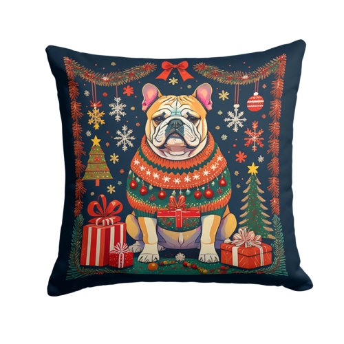 Throw Pillow featuring breed specific English Bulldog artwork. Celebrate Christmas with this Christmas Pillow. Add a touch of vibrancy and comfort to your outdoor seating with Caroline’s Treasures Fabric Decorative Pillow. Measuring approximately 14 inches by 14 inches, this outdoor pillow is crafted to elevate the appeal of your patio furniture, infusing it with vivid color and artistic flair. The pillow includes a 100% Polyester Fabric sham filled with a quality pillow form to provide superior comfort. Innovatively made from our brand new material, specifically woven for its water resistance, this pillow is designed for durability. The soft canvas fabric offers versatility in use, fit for your indoor couch or your outdoor patio, porch, or veranda. The fabric is dyed with colorfast dyes built for resilience against weather conditions, ensuring the pillow retains its beauty over time. Constructed by sewing three fabric pieces to create a sham, the polyester insert is then nestled inside to form the pillow, resulting in an overstuffed pillow that maintains its shape. Both the sham and the pillow insert are proudly made in the United States. As the pillows are handcrafted, there may be minor variations in size, further enhancing their unique charm. Experience comfort in style with Caroline’s Treasures Fabric Decorative Pillow.