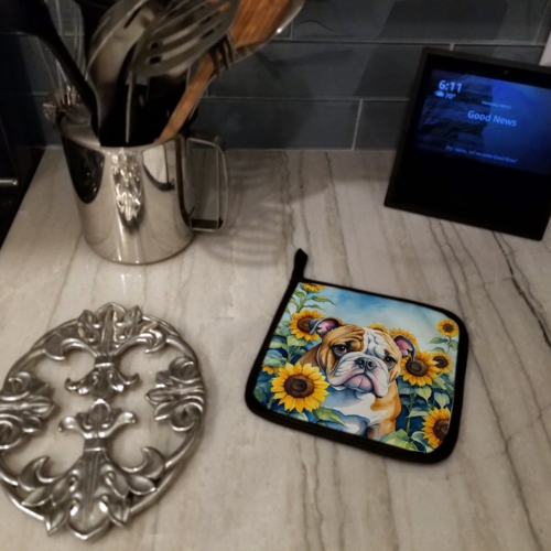 Pair of Pot Holders featuring breed specific English Bulldog artwork. A Pair of Pot Holders to match your kitchen decor. Made in the USA these are thick and functional. Full color artwork decorates the front polyester fabric of the hot pad and accented by a black trim. Use these at as a trivet for your Thanksgiving or Christmas tablescape. Filled with insulated fabric and quilted for durability. These colorful pot holders will make a great gift for your favorite home cook or executive chef. Each pot holder measures approximately 7 1/2 inches by 7 1/2 inches. A hanging tab is included.