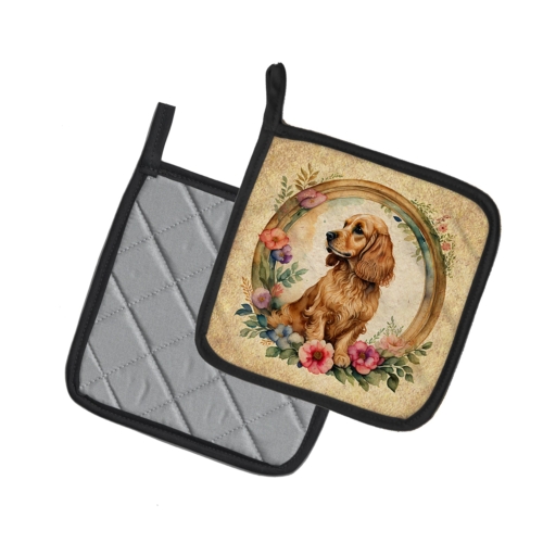 Pair of Pot Holders featuring breed specific English Cocker Spaniel artwork. A Pair of Pot Holders to match your kitchen decor. Made in the USA these are thick and functional. Full color artwork decorates the front polyester fabric of the hot pad and accented by a black trim. Use these at as a trivet for your Thanksgiving or Christmas tablescape. Filled with insulated fabric and quilted for durability. These colorful pot holders will make a great gift for your favorite home cook or executive chef. Each pot holder measures approximately 7 1/2 inches by 7 1/2 inches. A hanging tab is included.