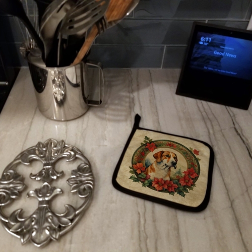 Pair of Pot Holders featuring breed specific English Foxhound artwork. Celebrate Christmas with this Christmas Pair of Pot Holders. A Pair of Pot Holders to match your kitchen decor. Made in the USA these are thick and functional. Full color artwork decorates the front polyester fabric of the hot pad and accented by a black trim. Use these at as a trivet for your Thanksgiving or Christmas tablescape. Filled with insulated fabric and quilted for durability. These colorful pot holders will make a great gift for your favorite home cook or executive chef. Each pot holder measures approximately 7 1/2 inches by 7 1/2 inches. A hanging tab is included.