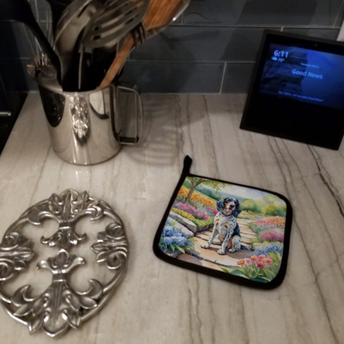 Pair of Pot Holders featuring breed specific English Setter artwork. A Pair of Pot Holders to match your kitchen decor. Made in the USA these are thick and functional. Full color artwork decorates the front polyester fabric of the hot pad and accented by a black trim. Use these at as a trivet for your Thanksgiving or Christmas tablescape. Filled with insulated fabric and quilted for durability. These colorful pot holders will make a great gift for your favorite home cook or executive chef. Each pot holder measures approximately 7 1/2 inches by 7 1/2 inches. A hanging tab is included.