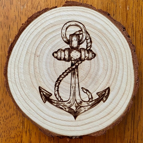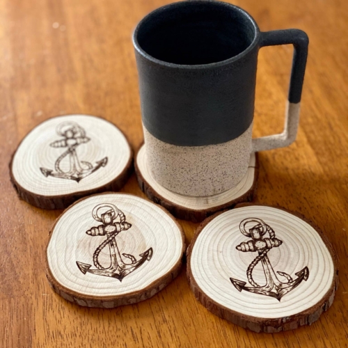 These coasters are approximately 4” in diameter and 3/8” thick. They’re made from live edge wood slices that are laser engraved with a nautical anchor illustration on one side. They are unfinished and smell quite nice.Details:• Each engraved wooden coaster is about 4″ in diameter 3/8″ thick• Made from California Pine wood slices• Laser engraved with a high level of precision