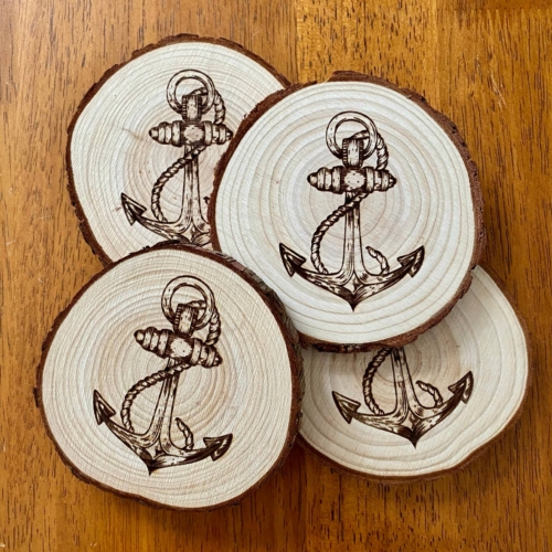 These coasters are approximately 4” in diameter and 3/8” thick. They’re made from live edge wood slices that are laser engraved with a nautical anchor illustration on one side. They are unfinished and smell quite nice.Details:• Each engraved wooden coaster is about 4″ in diameter 3/8″ thick• Made from California Pine wood slices• Laser engraved with a high level of precision