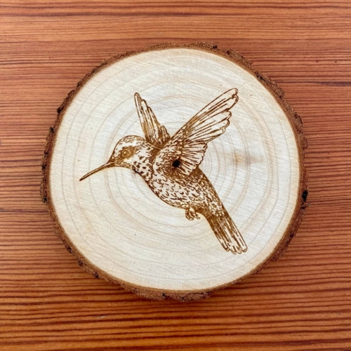 These coasters are approximately 4” in diameter and 3/8” thick. They’re made from live edge wood slices that are laser engraved with a hummingbird illustration on one side. They are unfinished and smell quite nice.Details:• Each engraved wooden coaster is about 4″ in diameter 3/8″ thick• Made from California Pine wood slices• Laser engraved with a high level of precision