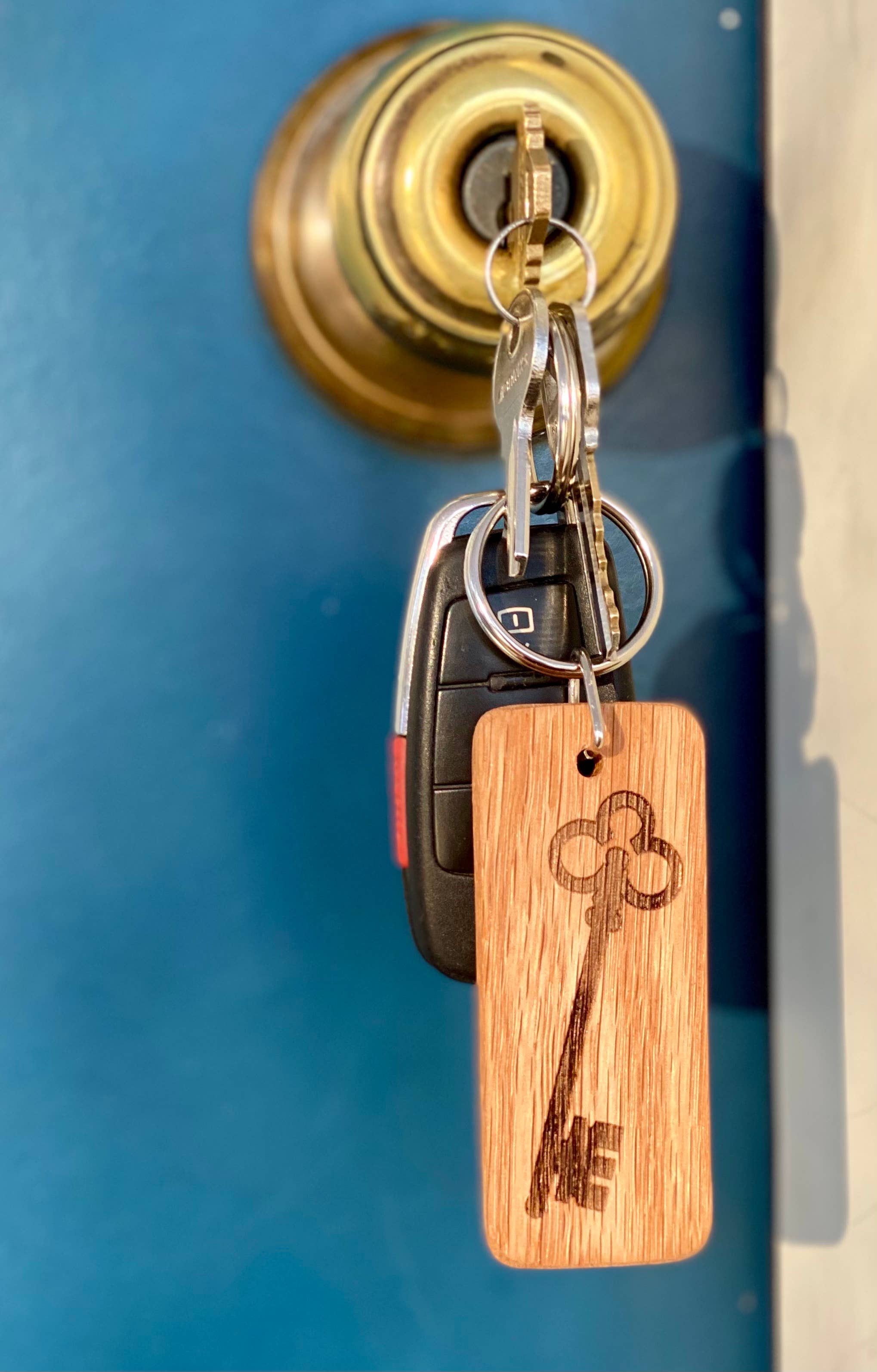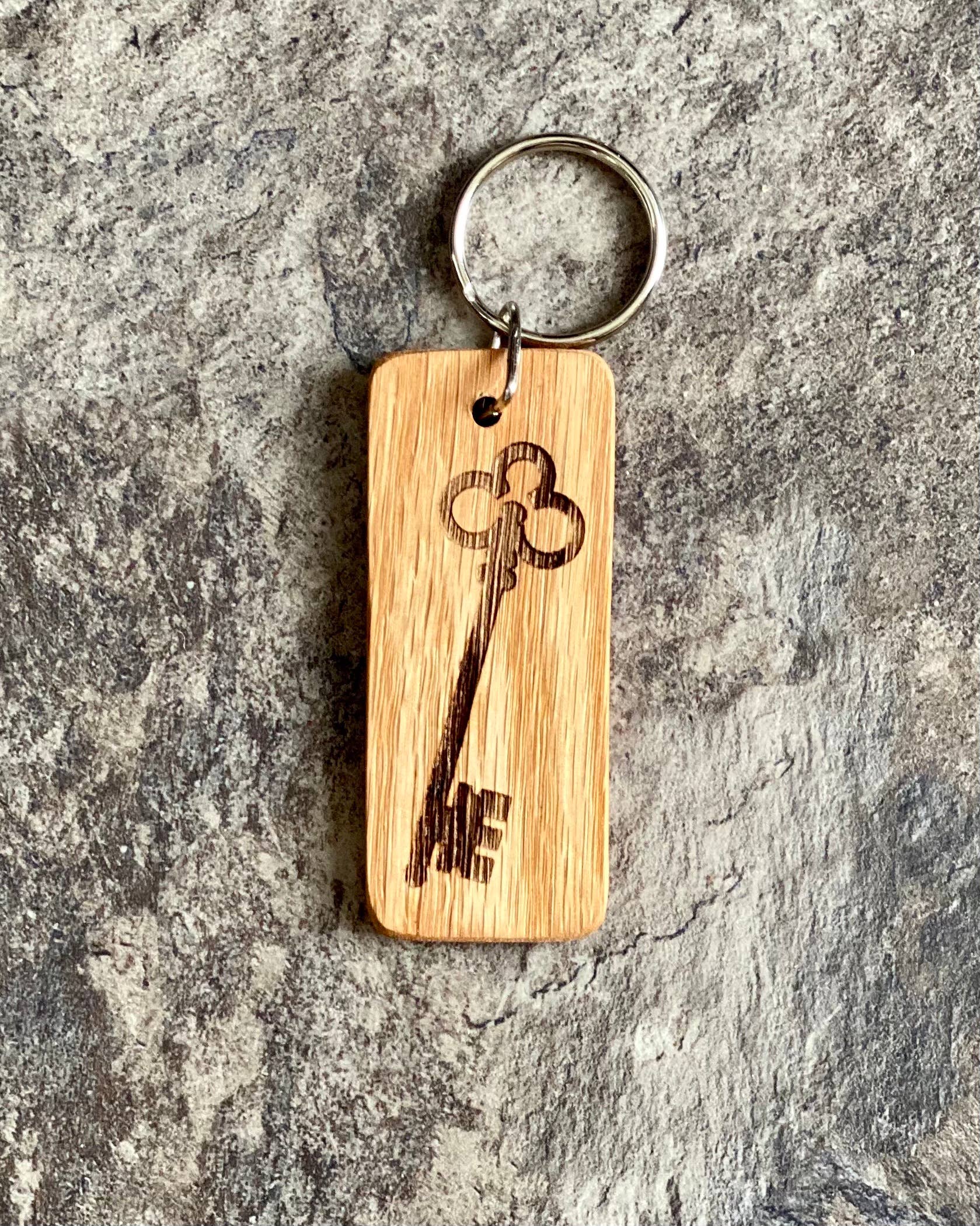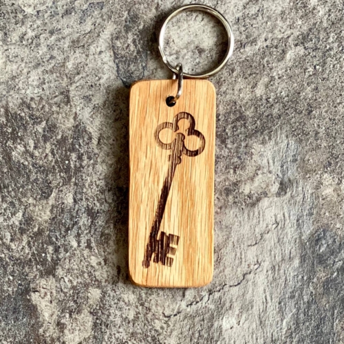 This laser engraved wood keychain makes the perfect rustic, stylish accent for any set of keys. It features a key silhouette laser engraved on one side.Wood Keychain Details:• Cut from 1/4″ thick solid hardwood oak• 3/16” thick, 3” long, and 1 1/4” wide • Laser engraved silhouette• Hand-sanded and finished with a natural linseed oil