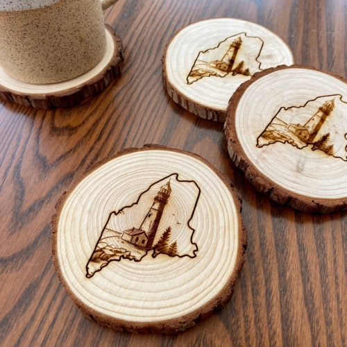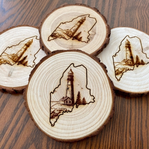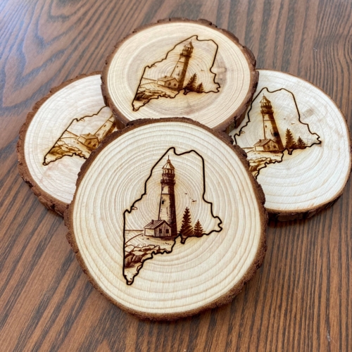 These coasters are approximately 4” in diameter and 3/8” thick. They’re made from live edge wood slices that are laser engraved with a Maine lighthouse scene within the state outline on one side. They are unfinished and smell quite nice.Details:• Each engraved wooden coaster is about 4″ in diameter 3/8″ thick• Made from California Pine wood slices• Laser engraved with a high level of precision