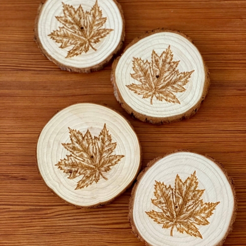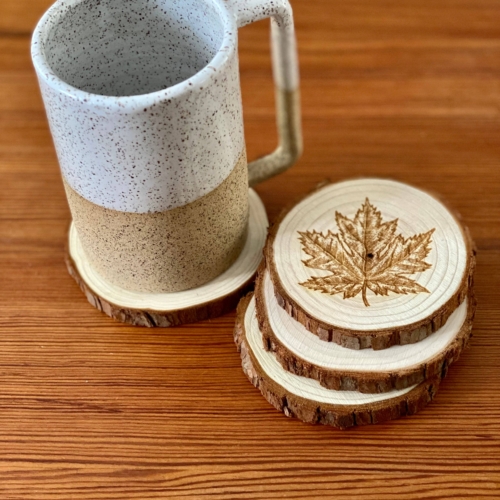 These coasters are approximately 4” in diameter and 3/8” thick. They’re made from live edge wood slices that are laser engraved with a maple leaf illustration on one side. They are unfinished and hold up to daily living quite well.Details:• Each engraved wooden coaster is about 4″ in diameter 3/8″ thick• Made from California Pine wood slices• Laser engraved with a high level of precision