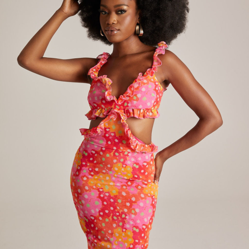 Cut out ruffle detailed maxi dress in our oh so yummy bubblegum print. The enitan dress looks good enough to eat and it feels just as good too. Model is 5ft9 and wears a UK 8 / US 4 In a non stretch georgette fabric in our custom bubblegum print.