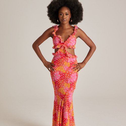 Cut out ruffle detailed maxi dress in our oh so yummy bubblegum print. The enitan dress looks good enough to eat and it feels just as good too. Model is 5ft9 and wears a UK 8 / US 4 In a non stretch georgette fabric in our custom bubblegum print.