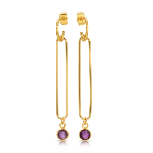 Our Best-Selling gemstone earrings for 3 years running. These gorgeous earrings are made with an 18k gold-plated brass long loop on a small post hoop. A delicate gemstone bezeled in gold vermeil dangles at the bottom. Choose from ten colors.- S925 silver post with gold plating- 18k gold-plated brass earring and back- 2.25″ length- Amethyst- Lead & Nickel Free- Handmade in California
