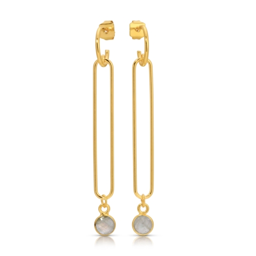 Our Best-Selling gemstone earrings for 3 years running. These gorgeous earrings are made with an 18k gold-plated brass long loop on a small post hoop. A delicate gemstone bezeled in gold vermeil dangles at the bottom. Choose from ten colors.- S925 silver post with gold plating- 18k gold-plated brass earring and back- 2.25″ length- Labradorite- Lead & Nickel Free- Handmade in California
