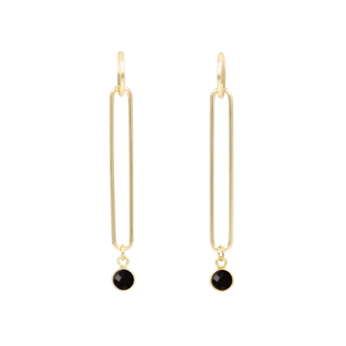Get Autumn and spooky season ready in style, with these stunning Onyx danglers The looper is our Best-Selling gemstone earrings for 3 years running. These gorgeous earrings are made with an 18k gold-plated brass long loop on a small post hoop. A delicate onyx bezeled in gold vermeil dangles at the bottom. The gemstone Onyx is more widely associated with strength, protection and will-power. – S925 silver post- 18k gold-plated brass earring and back- 2.25″ length- Onyx- Lead & Nickel Free- Handmade in California