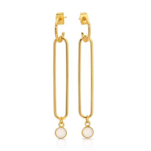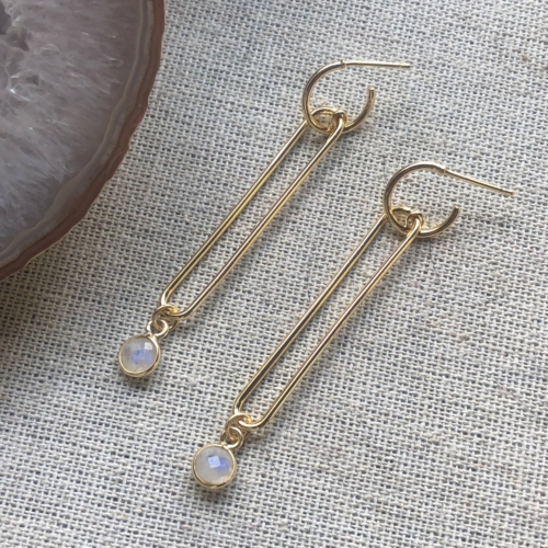 Our Best-Selling gemstone earrings for 3 years running. These gorgeous earrings are made with an 18k gold-plated brass long loop on a small post hoop. A delicate gemstone bezeled in gold vermeil dangles at the bottom. Choose from ten colors.- S925 silver post with gold plating- 18k gold-plated brass earring and back- 2.25″ length- Moonstone- Lead & Nickel Free- Handmade in California