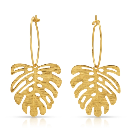 For the houseplant enthusiast. Textured brass monstera leaves dangle effortlessly from 3/4″ shiny gold hoops * Brass monstera leaf * Gold-over-brass hoop- nickel-free, hypo-allergenic * 3/4″ hoops * 1″ monstera charm * Handmade in California