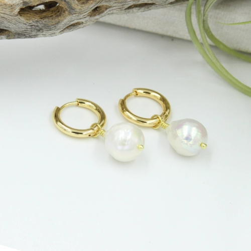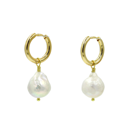 Proof that pearls aren’t just for Grannies and Politicians. Our newest hoops are the perfect pearl pair featuring fresh water pearl hand wire-wrapped onto our beautiful, high-quality chunky gold-plated hinged hoops. * 18k gold-plated stainless steel ear hoops (nickel-free) * Genuine Fresh Water Pearl * 1.5″ length * Handmade in California