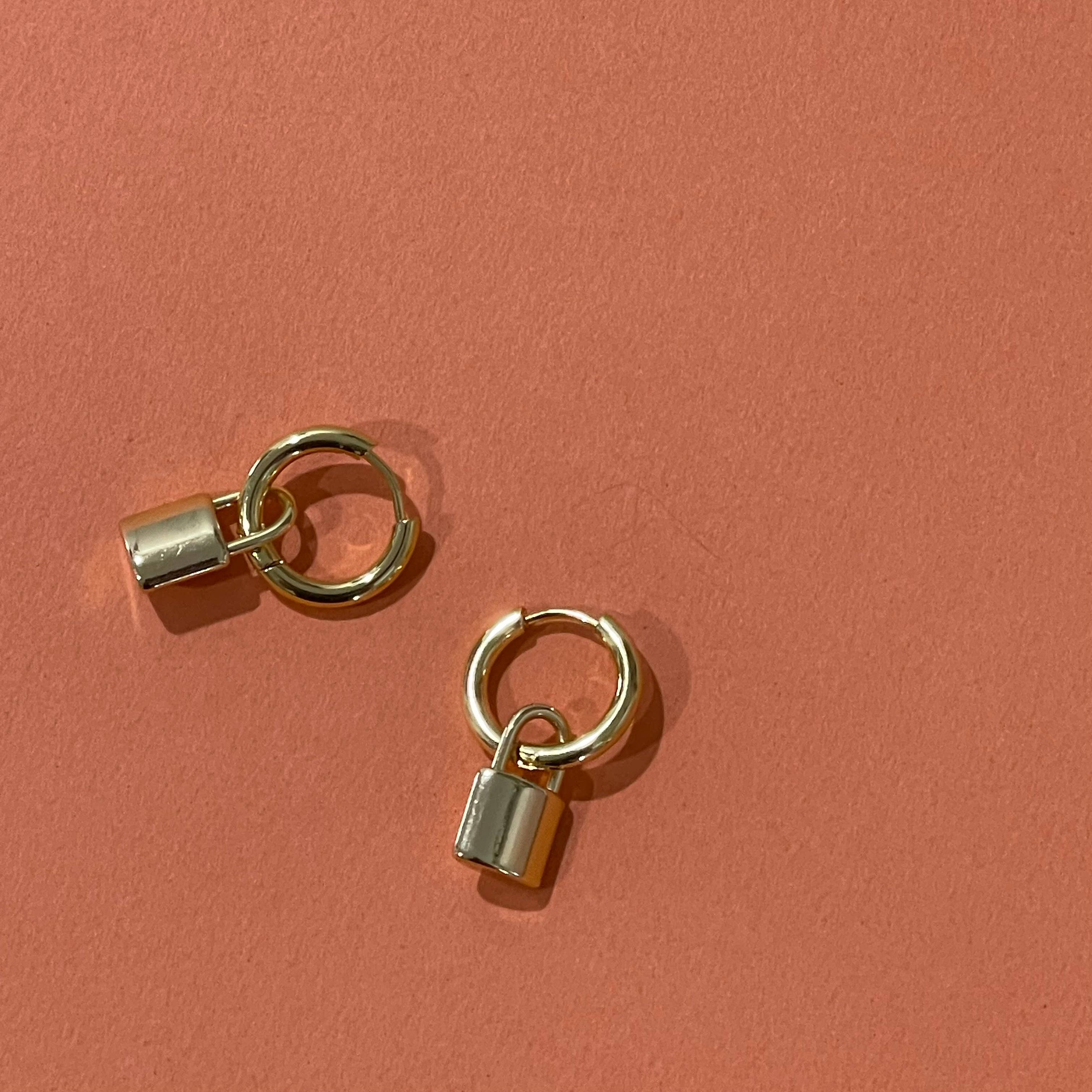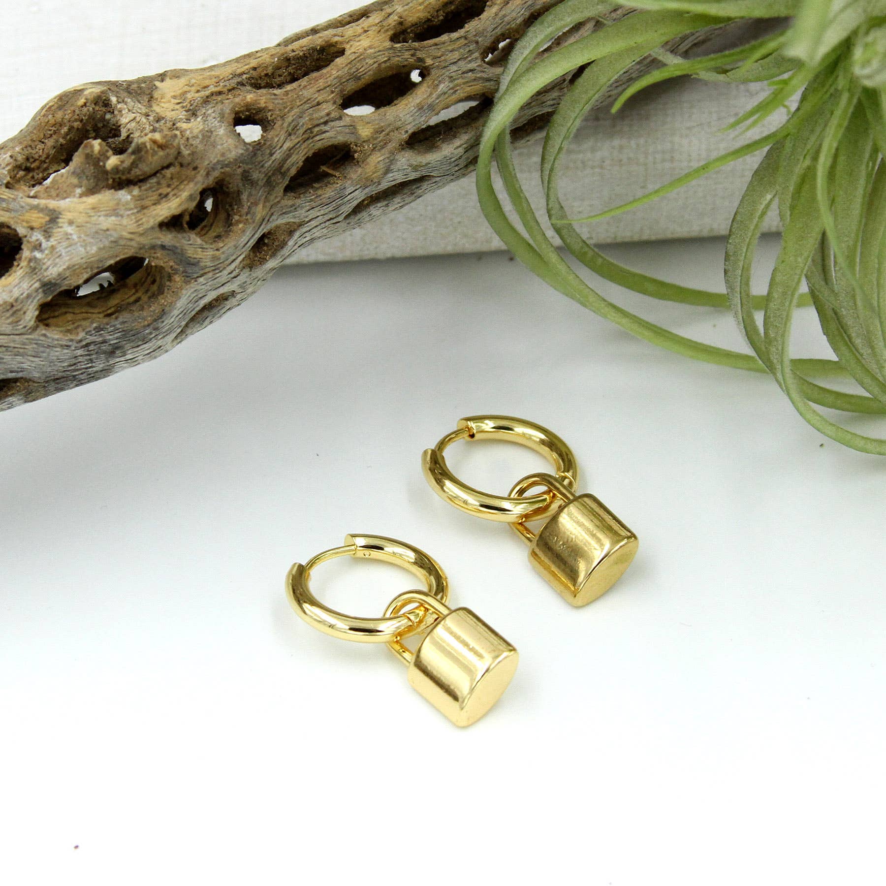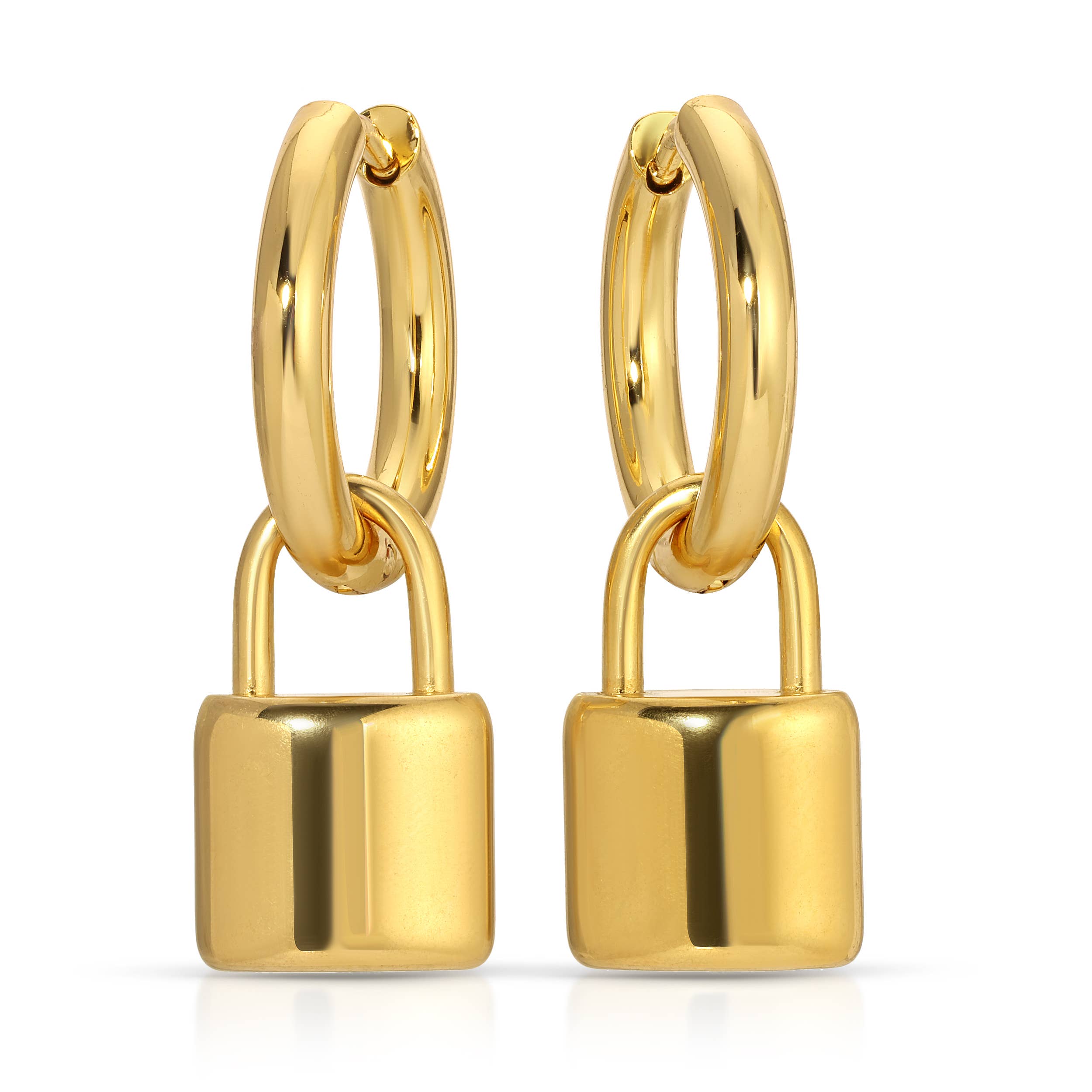 Get a lock on the perfect fall look, this subtle set features three-dimensional padlock charms that dangle from gold-plated thick hinged hoops. * 18k gold-plated stainless steel ear hoops (nickel-free) * Gold-plated stainless padlock charms (nickel-free) * 1.5″ length * Handmade in California