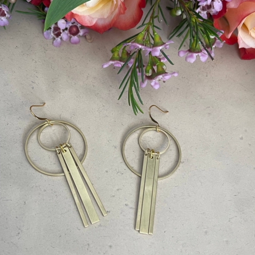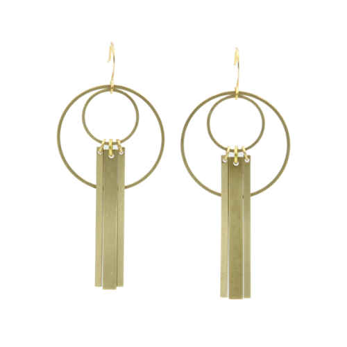 These fun danglers, newly launced this spring are fast becoming a best seller. Brushed raw (lacquered) rings and bars combine to create this striking geo-chic dangle earrings- Gold-plated brass ear-wires (nickel-free)- Brushed raw, lacquered brass- 2.5″ length- Handmade USA(Listing is for single pair of earrings shown in image1, For Necklace see NK-495)