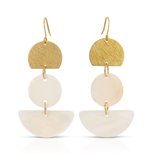 Breezy and lightweight, these textured brass and mother of pearl geometric shapes make bold statement. – Raw Textured (lacquered) brass- mother of pear- Gold-over-brass ear wire – 2.5″ length- Handmade in California