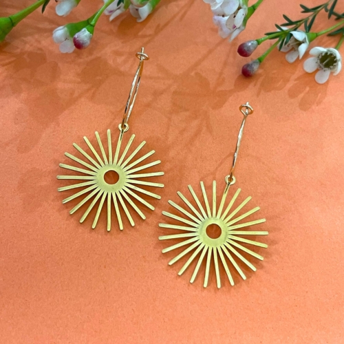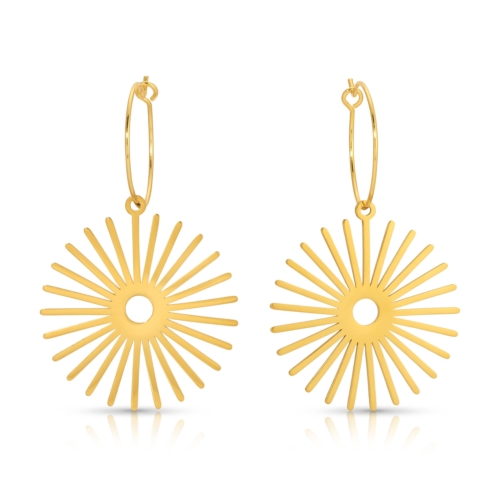 Sunny radial shapes in shiny gold hang from gold hoops- 3/4″ 18k gold-plated brass hoops (nickel-free)- Gold-plated stainless laser sun charms- 1″ charms- 1.75″ length- Handmade in California