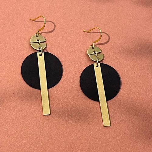 Simple, elegant two-tone black and brass dangle earrings are a perfect pairing with any of our other two-tone or brass pieces. Lacquered raw brass – 1″ Blackened brass disk – Raw brass bar and half circles- Gold-over-brass nickel-free ear wire – 2″ length – Handmade in California
