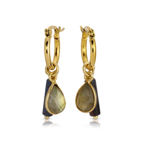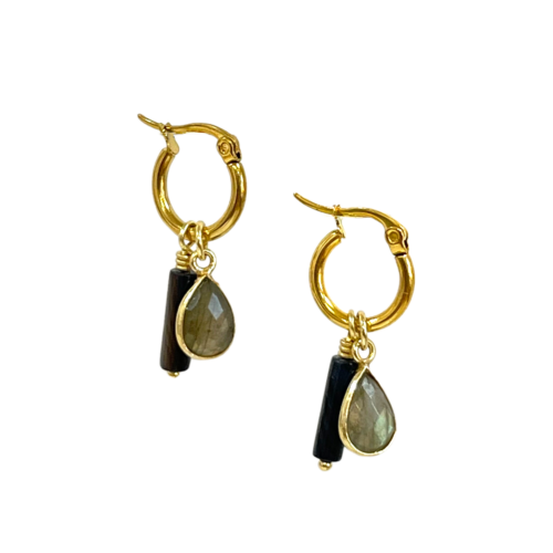 Dark and moody, elegance abounds with our Baby Cluster Hoops in deep iridescent tones. These lovely fall hoops feature stunning labradorite bezeled drops and a delicate shell tube bead, the perfect blend of natural beauty and modern design.- “Vintage” gold plated stainless .5″ hoops- Faceted labradorite in gold vermeil bezel- Dark blue/grey shell tube bead- 1.25″ L- Handmade in California