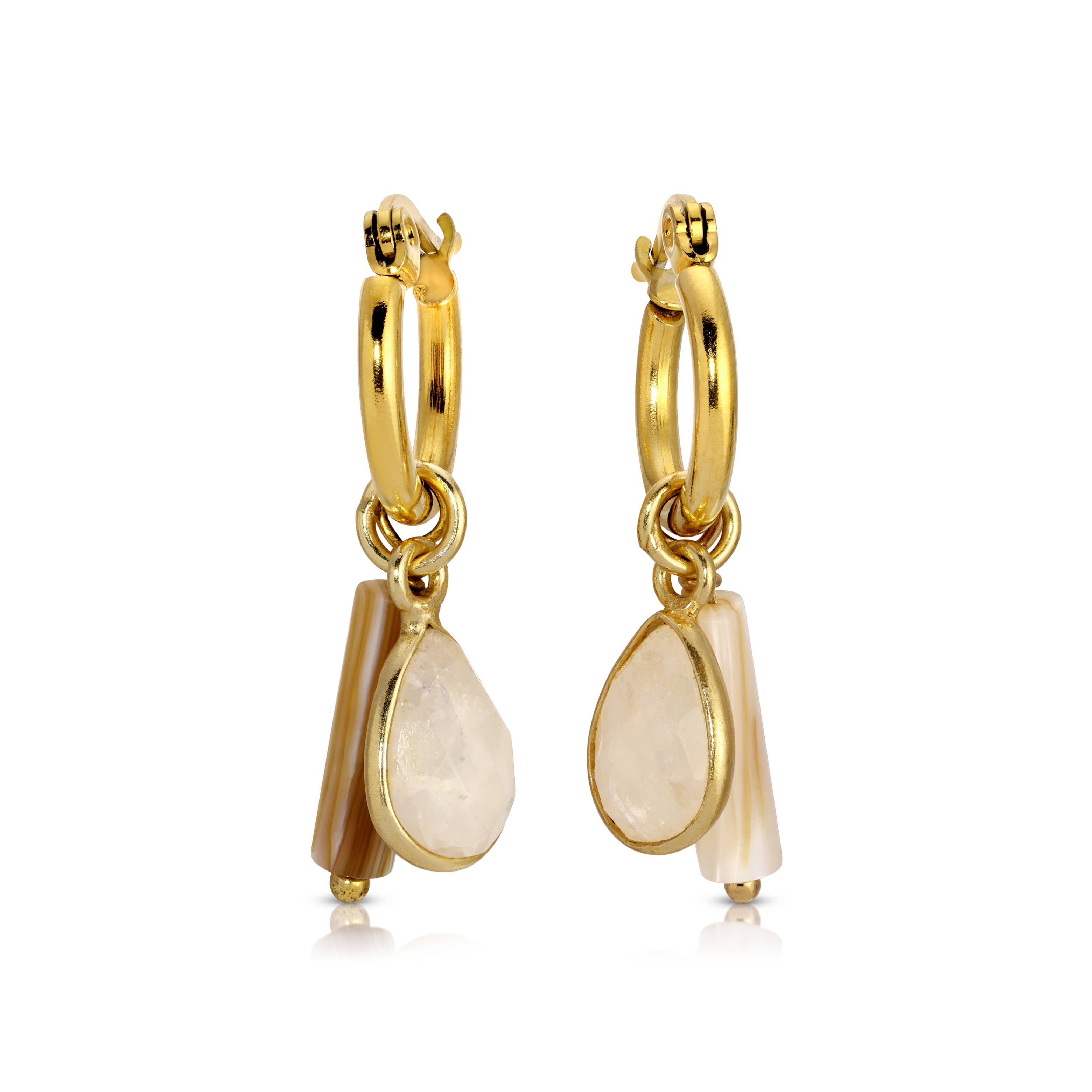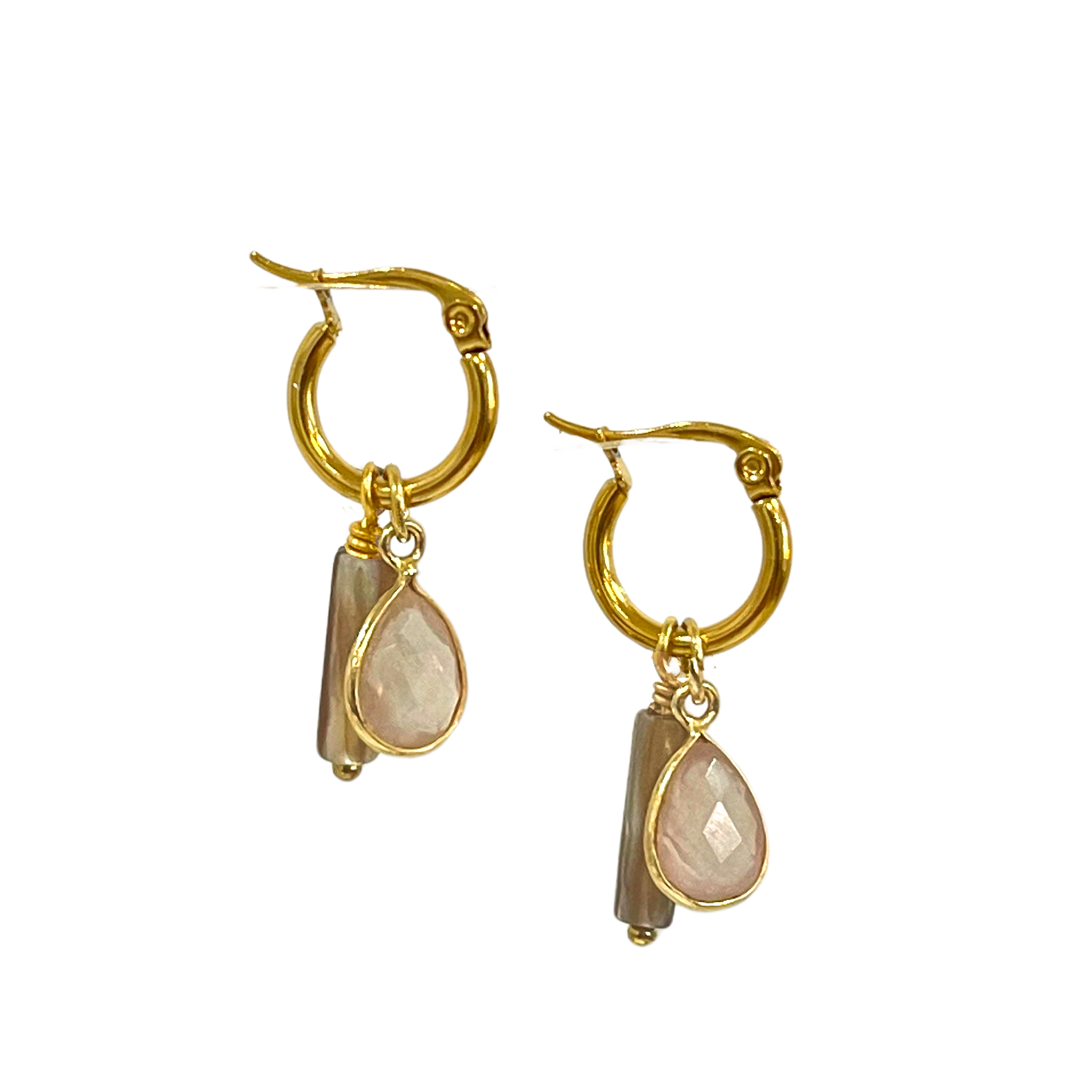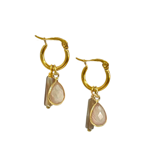 Add a touch of enchanting elegance to your jewelry collection with our Mini Cluster Hoops. Featuring a stunning rose bezeled drop and a delicate shell tube bead, these hoops are the perfect blend of natural beauty and modern design.- “Vintage” gold plated stainless .5″ hoops- Faceted rose quartz in gold vermeil bezel- beige color shell tube bead- 1.25″ L- Handmade in California