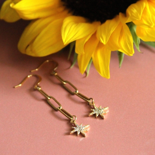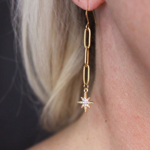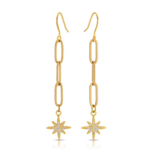 Celestial and stunning, these feminine danglers feature diminutive yet super sparkly pave stars & dangle from our favorite textured paperclip chain. – Gold plated Stainless chain- Gold Plated Stainless stars with CZ- Gold Plated Hypoallergenic Ear-wire- 3″ length- Handmade USA
