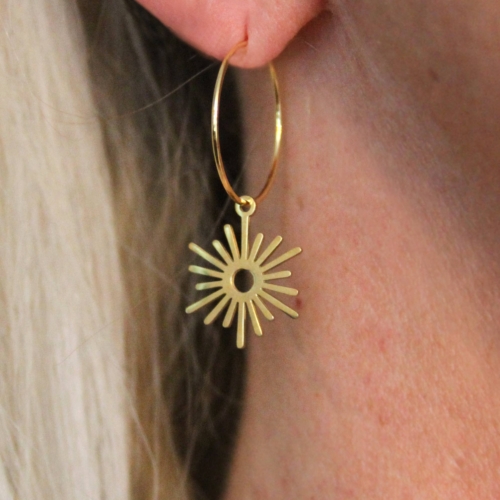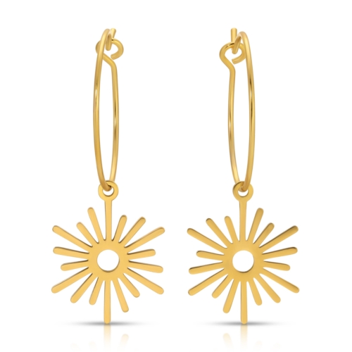 Mini laser cut stainless sun on gold-plated hoops. Time to shine!- 3/4″ 18k gold-plated brass hoops (nickel-free)- Gold-plated stainless laser cut sun charms- .6″ charms- 1.25″ length- Handmade in California