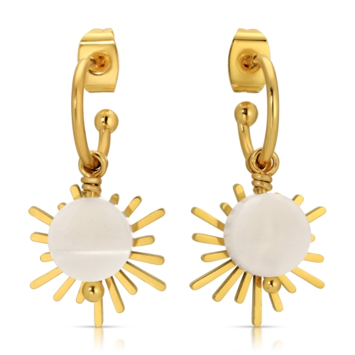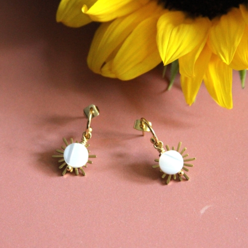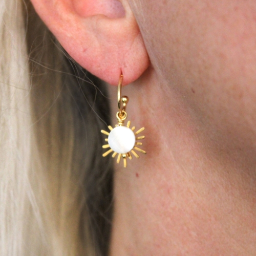Mini stainless suns and hand wire-wrapped mother of pearl combine in these dainty hoop earrings- 18k” gold-plated stainless hoops & suns- 12mm” mother of pearl beas- Handmade in California