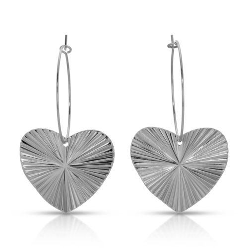 For the bold romantic, large 1.25″ 18k plated hearts with vintage style radiating line texture. Hearts are big enough to make a statement but super lightweight and wearable. -Rhodium plated; stainless heart-Rhodium plate brass hoop, hypoallergenic-2″ length-Handmade in California