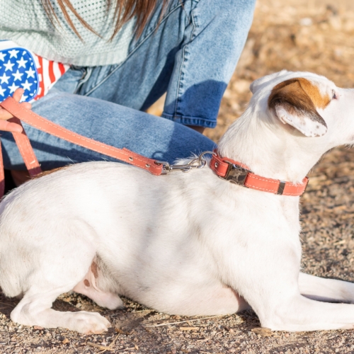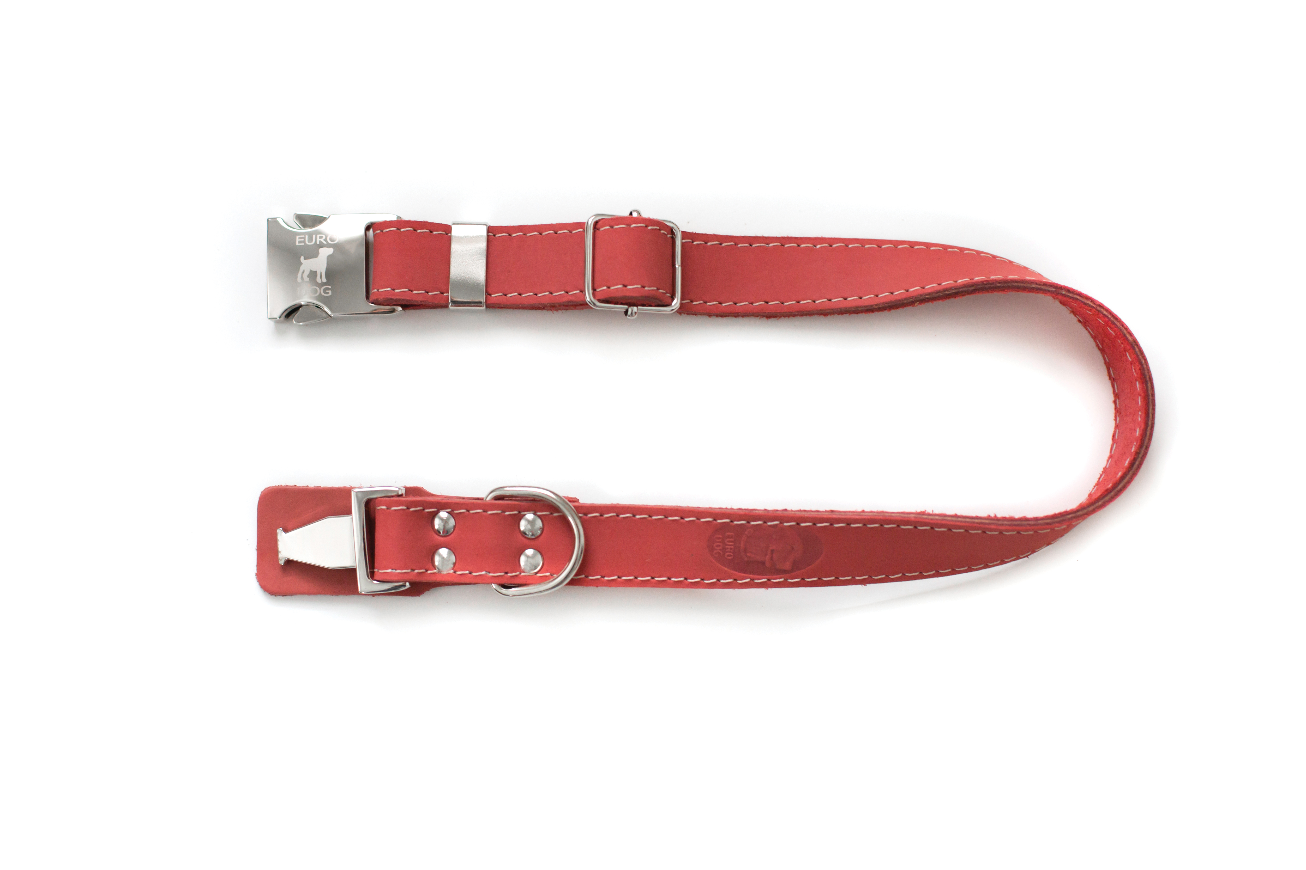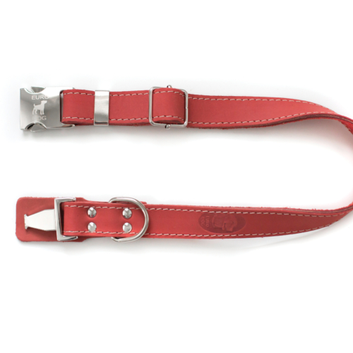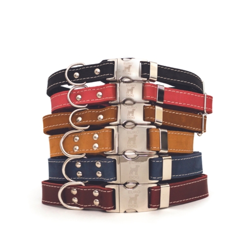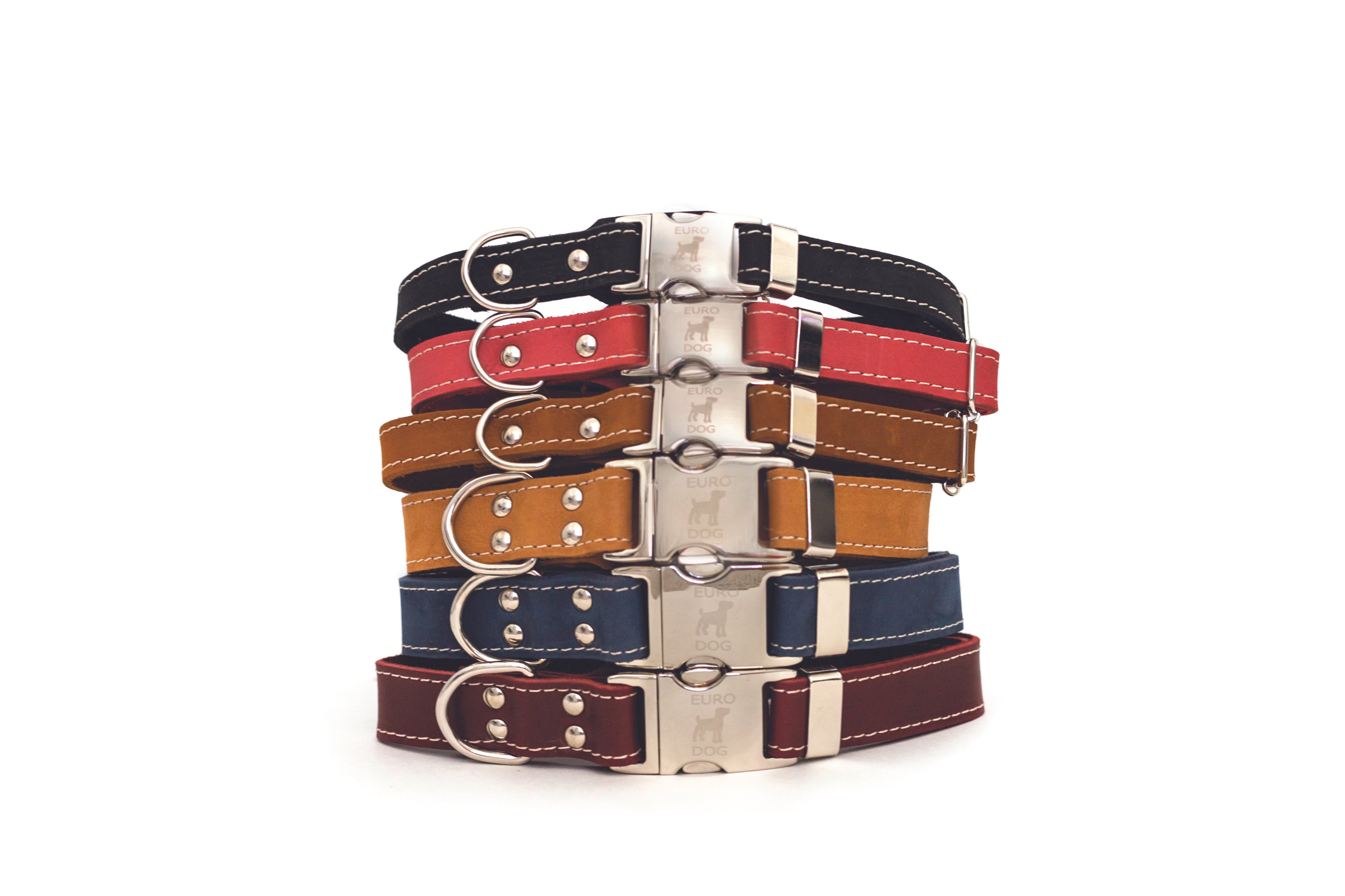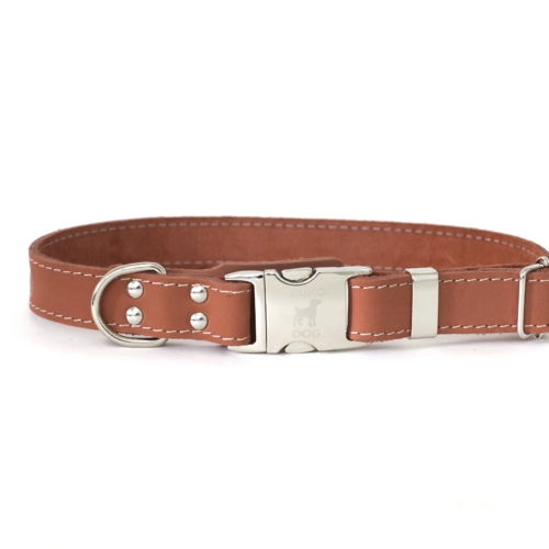 A genuine leather flat collar ornamented with polyester stitching making the collar pop and a tongue of extra leather to protect your pup. The most advanced quick-release metal buckle on the market!