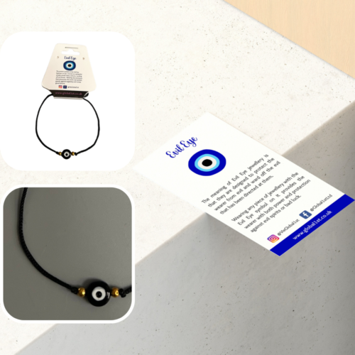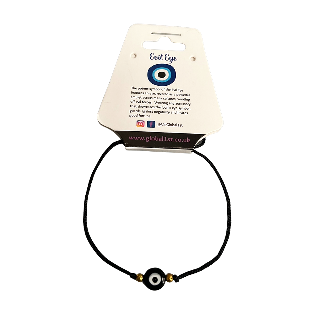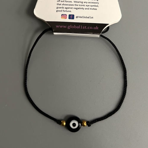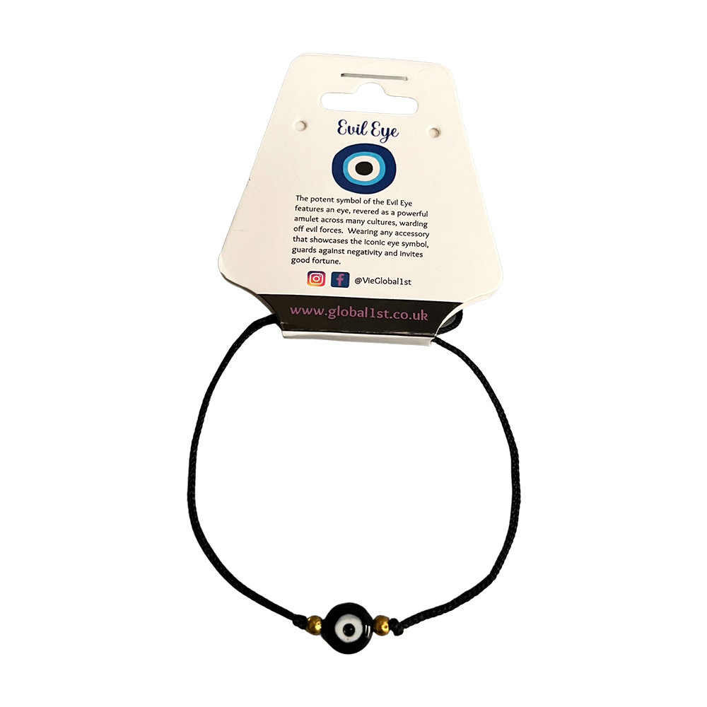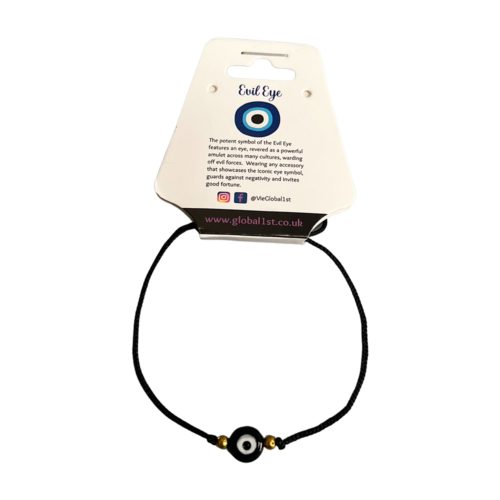 Evil Eye Coloured Bracelets with glass bead centre, gold-tone accents, and adjustable cord. Available in multiple colours. A great addition to jewellery ranges for gift shops and spiritual retailers.
