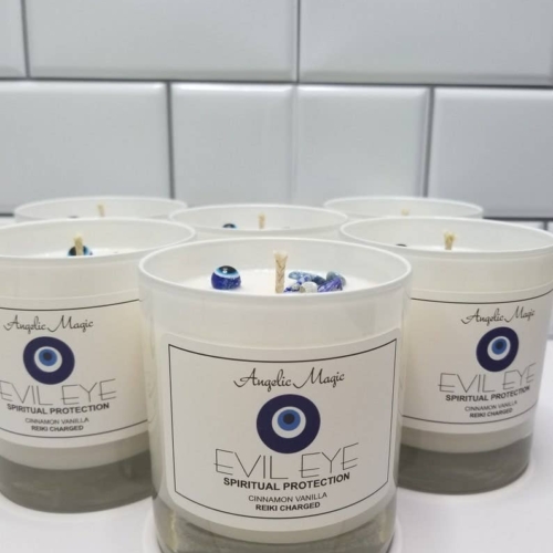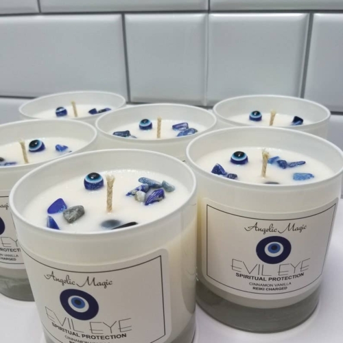 100% Natural Soy WaxReiki Charged Scent Cinnamon & VanillaCrystals Onyx & Lapis LazuliEvil Eye Talisman11oz Glass Jar Rose Gold LidTop-Clove, CinnamonMiddle-CreamBase-VanillaThe evil eye is a “look” or “stare” that is believed to bring bad luck for the person at whom it is directed for reasons of envy or dislike. … An evil eye is a talisman or amulet, designed in the shape of an eye, traditionally in the colors blue or green, that indicate spiritual protection.An evil eye with them, it guards against misfortune happening in one’s life. The evil eye brings good luck and protects you from any ill-will that could otherwise have a negative effect on your well-being or your life in general.
