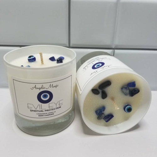 100% Natural Soy WaxReiki Charged Scent Cinnamon & VanillaCrystals Onyx & Lapis LazuliEvil Eye Talisman11oz Glass Jar Rose Gold LidTop-Clove, CinnamonMiddle-CreamBase-VanillaThe evil eye is a “look” or “stare” that is believed to bring bad luck for the person at whom it is directed for reasons of envy or dislike. … An evil eye is a talisman or amulet, designed in the shape of an eye, traditionally in the colors blue or green, that indicate spiritual protection.An evil eye with them, it guards against misfortune happening in one’s life. The evil eye brings good luck and protects you from any ill-will that could otherwise have a negative effect on your well-being or your life in general.