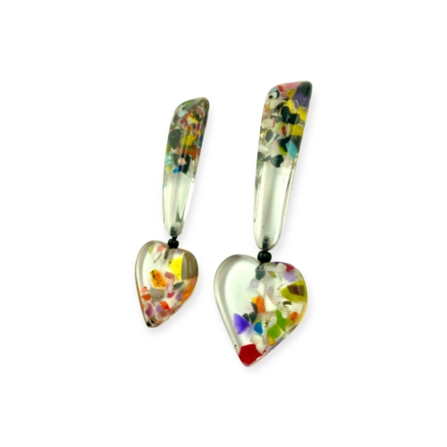 Experience the magic of wearable art with these heart-shaped earrings from Atelier 1701. The long, elegant tops are infused with a captivating blend of colors, gracefully transitioning into the heart-shaped pendants below. Each piece is meticulously handcrafted, showcasing a clear resin base filled with vibrant multicolored fragments. These earrings are perfect for adding a touch of playful sophistication to any outfit, reflecting the unique artistry and craftsmanship that Atelier 1701 is known for. Please note, the picture is a reference as each piece is unique.