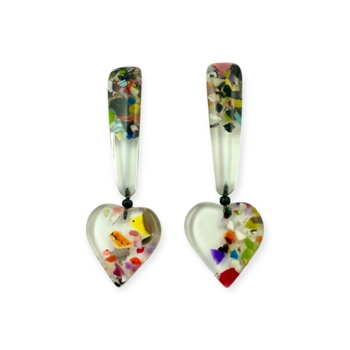 Experience the magic of wearable art with these heart-shaped earrings from Atelier 1701. The long, elegant tops are infused with a captivating blend of colors, gracefully transitioning into the heart-shaped pendants below. Each piece is meticulously handcrafted, showcasing a clear resin base filled with vibrant multicolored fragments. These earrings are perfect for adding a touch of playful sophistication to any outfit, reflecting the unique artistry and craftsmanship that Atelier 1701 is known for. Please note, the picture is a reference as each piece is unique.
