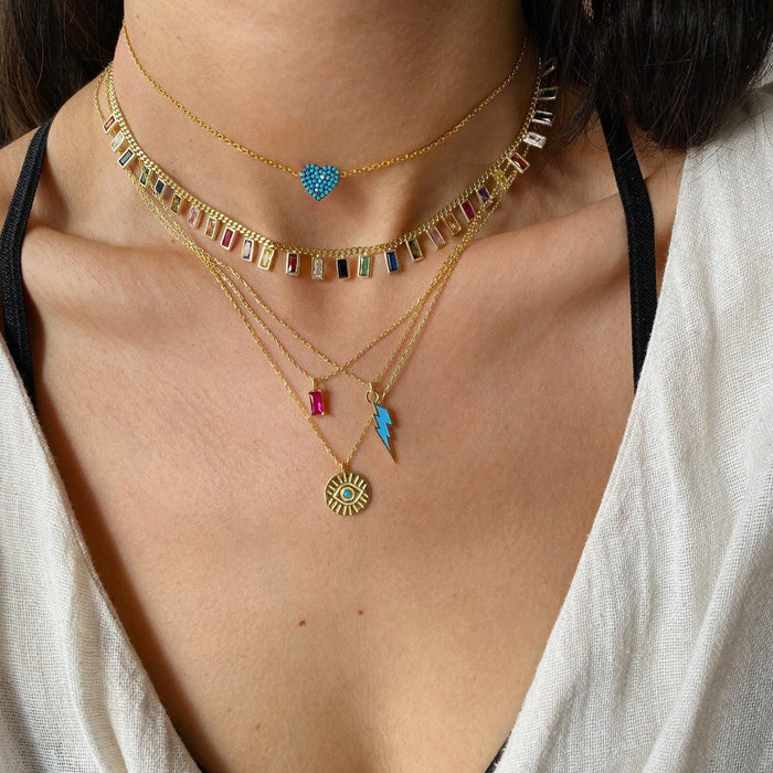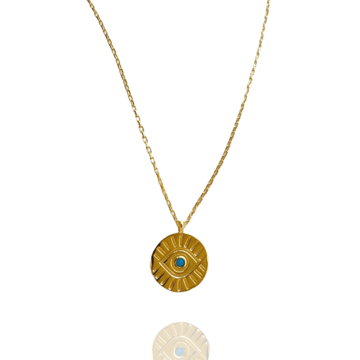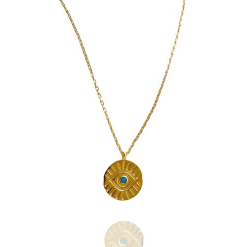 Let’s ward off bad luck by bringing good fortune, success, and hope to your life with this Eye Coin Evil Eye Necklace. This necklace is handmade in recycled 925 sterling silver material that is premium-quality, lightweight, sturdy, and brightly polished. Owing to its design, it highlights an eye in a coin pattern with a turquoise stone at the center- all wrapped in a lustrous gold-tone setting. Wear it alone for a minimalist look, or layer it with linking chains, charm pendants, and statement necklaces for a trendy layered look.