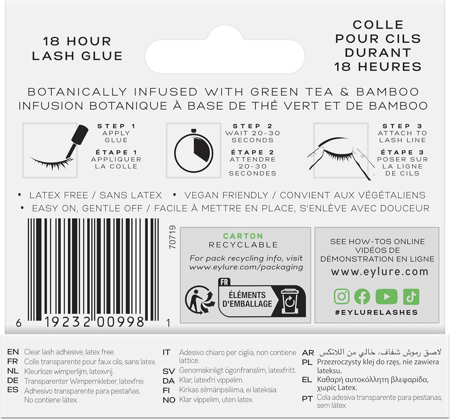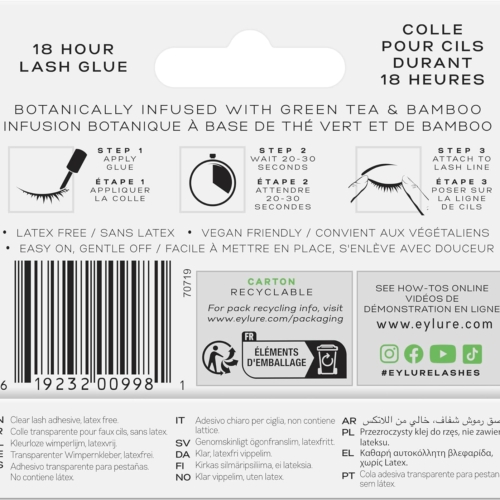 Product Description The Eylure 18-Hour Lash Glue is the perfect blend of performance and care. Quick-drying, long-lasting, and formaldehyde-free, this cruelty-free adhesive is botanically infused with Green Tea and Bamboo. It has also been Dermatologically tested and is latex-free. We’re so confident in its strength that we guarantee it to last up to 18 hours. Plus, the brush applicator makes it a breeze to apply. Get ready for lash perfection. Safety Warning Avoid contact with eyes. Keep away from naked flame or direct heat sources. Long-lasting durability Enhanced features Reliable performance Durable construction Reliable performance Wide range of features Brand Eylure Item form Pair Colour Black Item package quantity 1 Package information