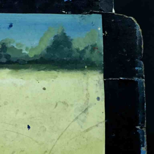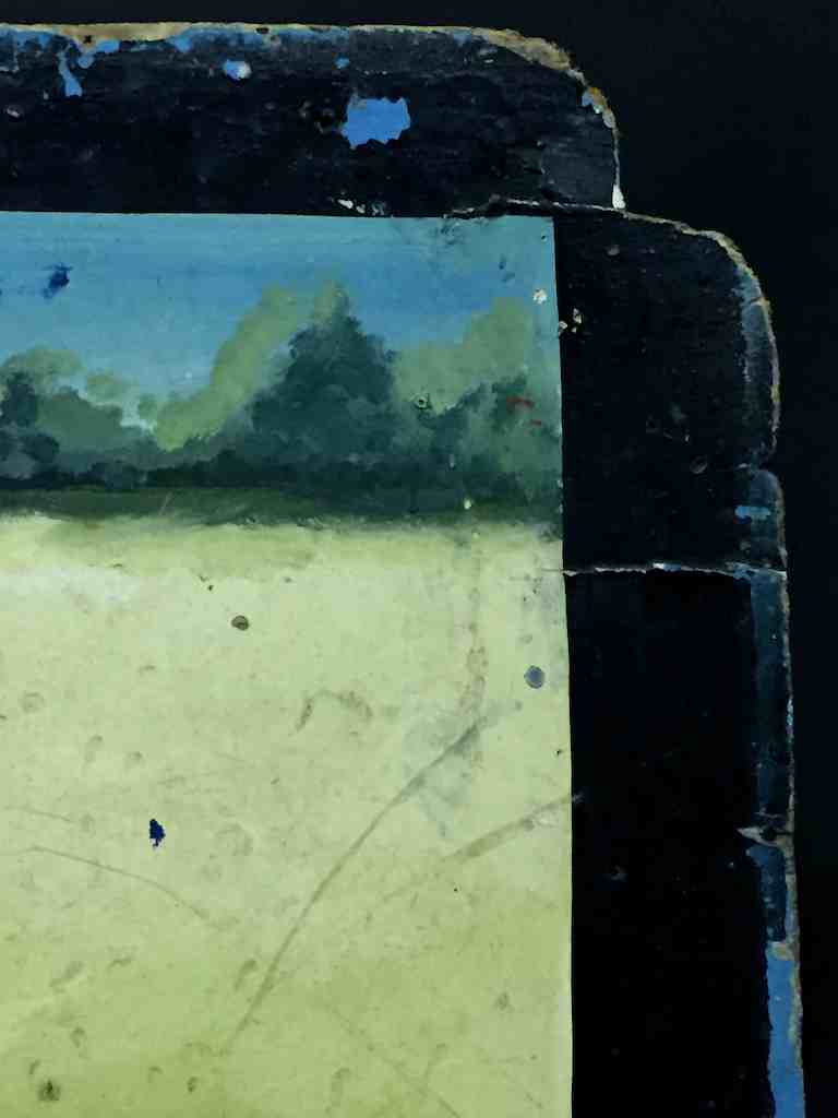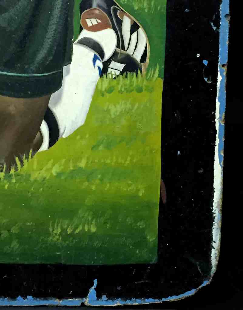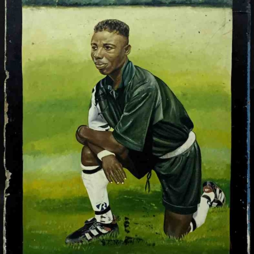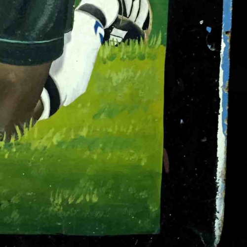 Although the most well-known form of commercial art in Africa is the barbershop or beauty salon sign, those who paint those signs are truly accomplished artists. They are able to paint for anyone’s purposes and often advertise their own artistic talents painting whatever subject appeals to them, most commonly stars of sports and music, athletes and musicians. As in most of the world, football aka soccer, is the most popular sport in Ghana and this man, Mallam Yahaya has been one of its biggest stars. When he was much younger, an up and coming player on the national football scene in Ghana, he played for the National Under-17 Team, the Black Starlets (the national team is called the Black Stars). Now, at 41, he plays for a German team, Amicitia Viernheim. This portrait of his, painted years ago, measures 39 1/4 x 30″ (1 m x 76 cm), a large painting. In this rendition of this well-known man in Ghana, he is wearing a green Ghanaian team football/soccer kit, white knee high soccer socks and black and white striped soccer shoes. He is kneeling on a green football/soccer pitch, his arms crossed on his right knee. The sky is visible in the background above the trees. The painting is on a thin board with a black border, very worn around the edges, the wear which is common on a genuine, older, used sign.