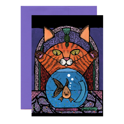 “Feline Fortune Teller” stares down at her crystal ball fishbowl and reads the future, “Your future looks fishtabulous!”. This is such a positive, inspirational message for anyone graduating or making a change in their life. The cat fortune teller is reading her crystal ball fishbowl with great excitement.