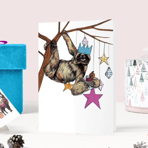 A fun Christmas card featuring a merry, mulled wine drinking Sloth.