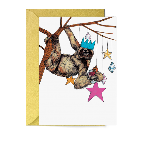 A fun Christmas card featuring a merry, mulled wine drinking Sloth.