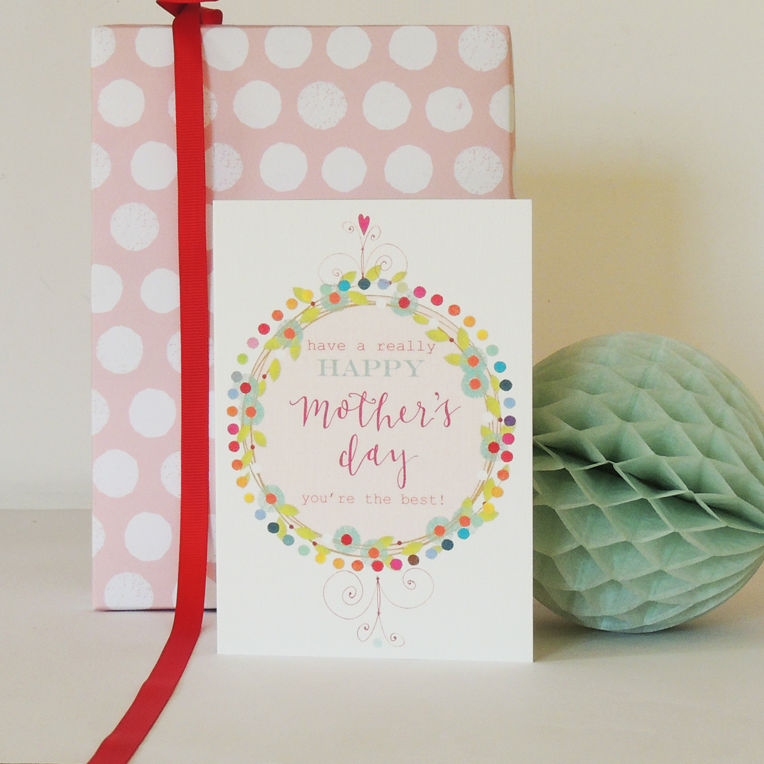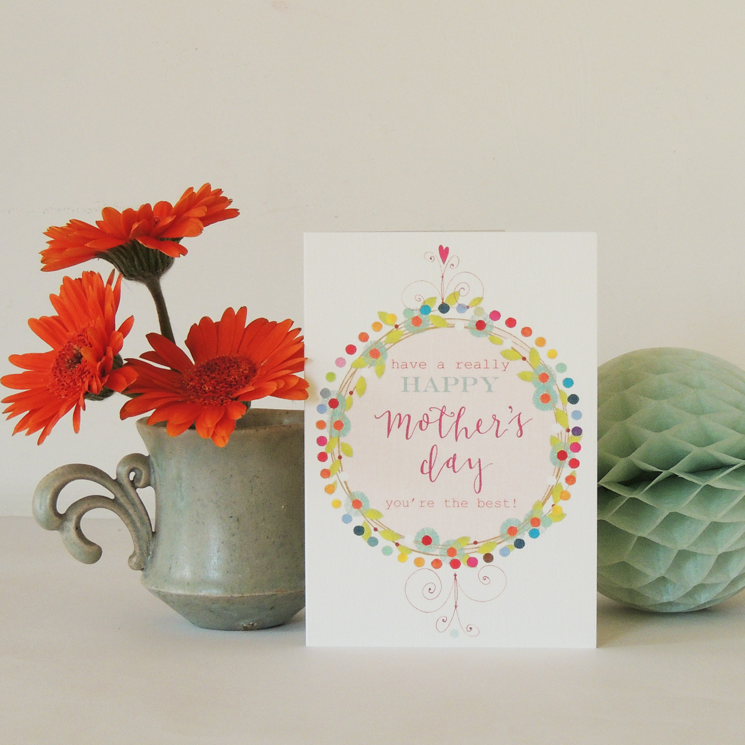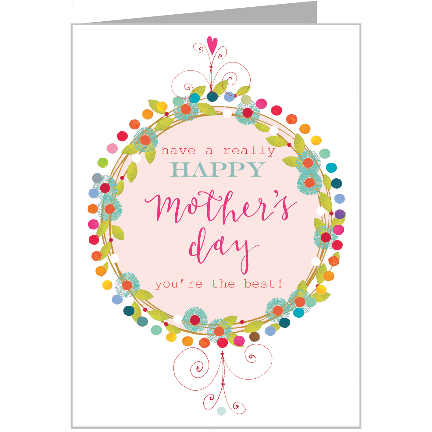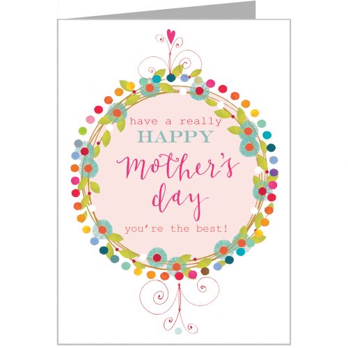 Wish a mother a happy Mother’s Day with this gorgeous greetings card, featuring a floral wreath and swirly accents.