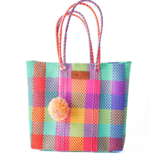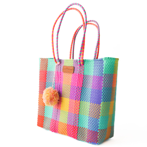 Effortlessly Stylish. Endlessly Practical. Our Woven Tote Bags are the perfect balance of artisan charm and everyday function. Handwoven from 100% recycled plastic by skilled artisans in Mexico, these totes are built to last—and designed to go everywhere with you. Whether you’re heading to work, packing for a weekend trip, or making a quick stop at the market, this eco-friendly tote has you covered in style. Product Features: Eco-Friendly & Handmade – Crafted with 100% recycled plastic, each tote supports sustainable living and traditional artisan techniques. Water-Resistant & Durable – Lightweight yet strong, designed for everyday use and built to withstand the elements. Spacious & Secure Interior – Roomy enough to fit a 13″ laptop, tablet, books, water bottle, wallet, and more—all secured with a magnetic snap closure. Removable Zippered Pouch – Includes a fabric insert to hold smaller items like your phone, keys, or makeup. One-of-a-Kind Design – Every bag takes 20–40 hours to make by hand and may have slight color and size variations. Customization Options: Pair with a with a playful Pompom for a touch of personality or bundle with a Checs Nylon Pouch for added functionality –With the purchase of a Woven Bag, get a Checs Nylon Pouch for $20.00 click here to buy as bundle. Bonus Pompom – Comes with a free pompom (while supplies last – colors and sizes vary). Explore the complete Fiesta Collection.