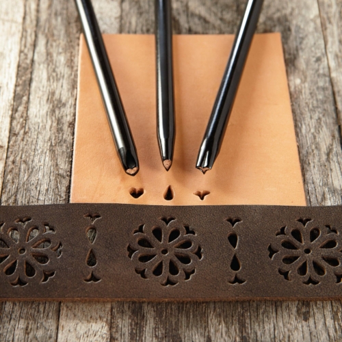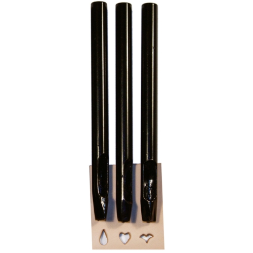 3 popular shape punches in one economical set. Combine shapes to create beautiful filigree designs and borders on your leather projects. Punches are quality machined hardened steel designed for long use. Set includes: Wing, Heart and Tear Drop Shapes. Shape size: 5 mm