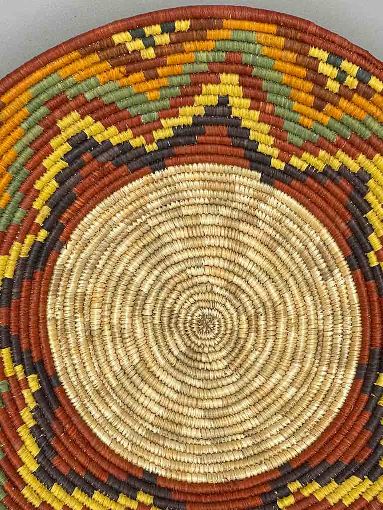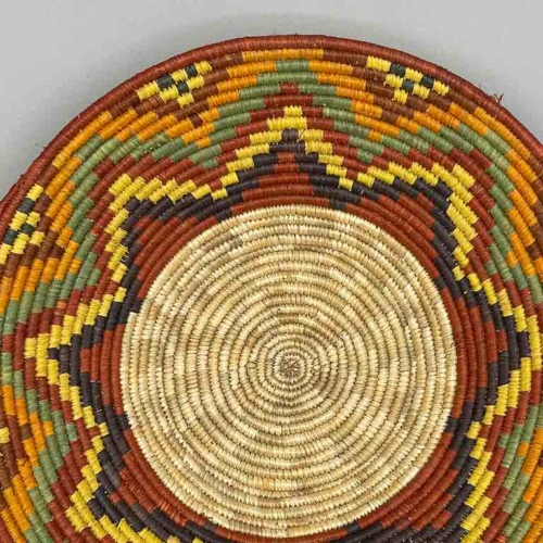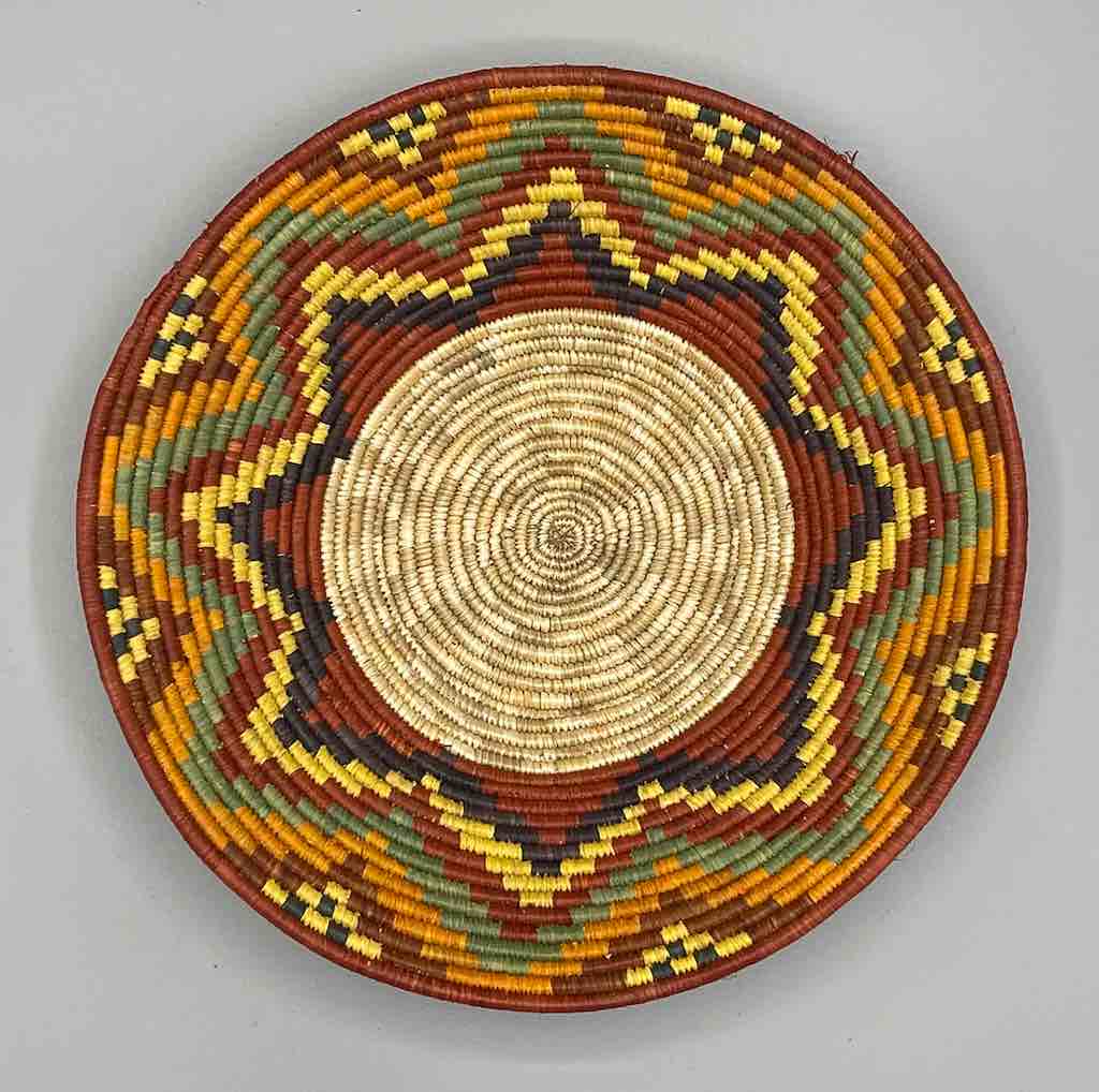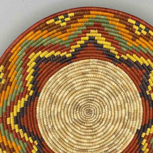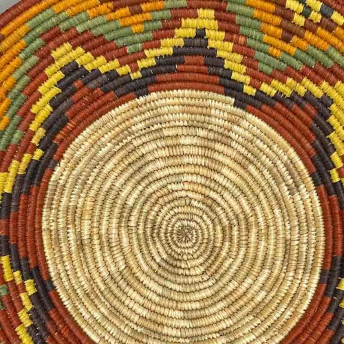 This basket/bowl is one of the thinnest coil and therefore finest quality woven basket in Africa. The design is among the most intricate, demonstrating the very advanced skill of the women of the Batoro tribe who make these in Uganda, near the Ruwenzori Mountains. This one is relatively small which affords the woman who made it to show off her exceptional basket weaving ability at a lower cost. We think these are the most beautiful and finest quality baskets we have ever seen, reflecting the unbelievable ingenuity of these amazing Ugandan artisans. Locally available natural dyes are used to create the vibrant colors which contribute to the beauty of these baskets This basket measures 10″ in diameter x 2″ deep (25 x 5 cm)