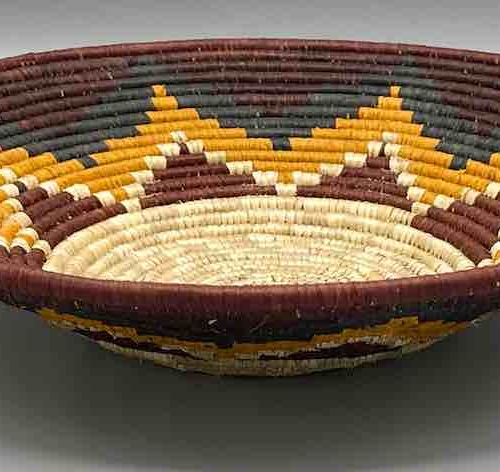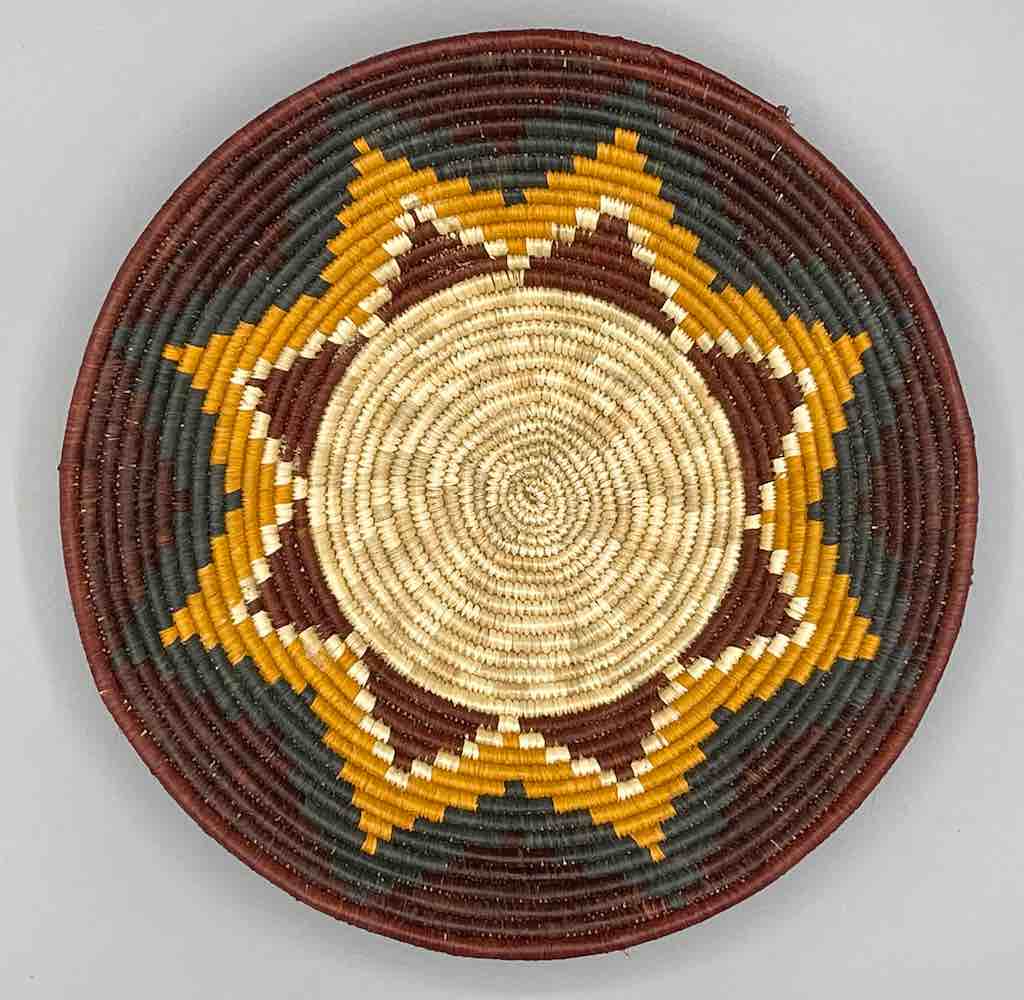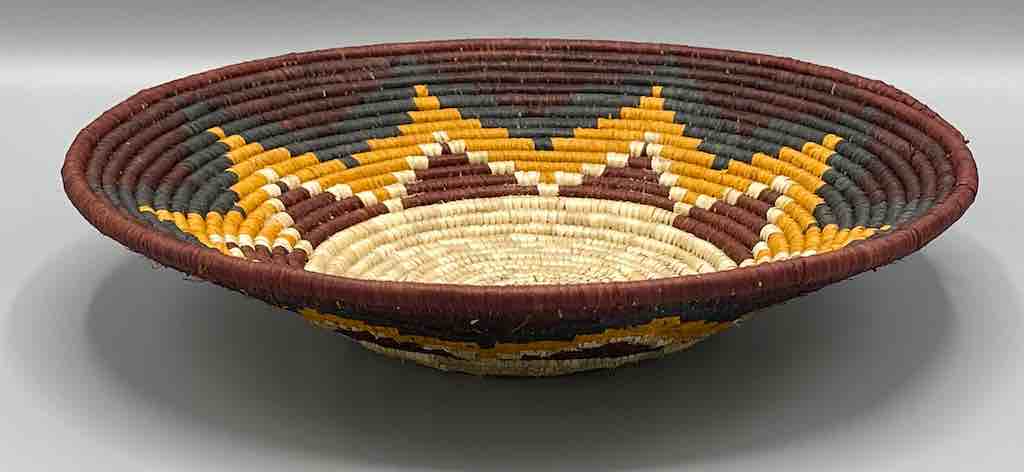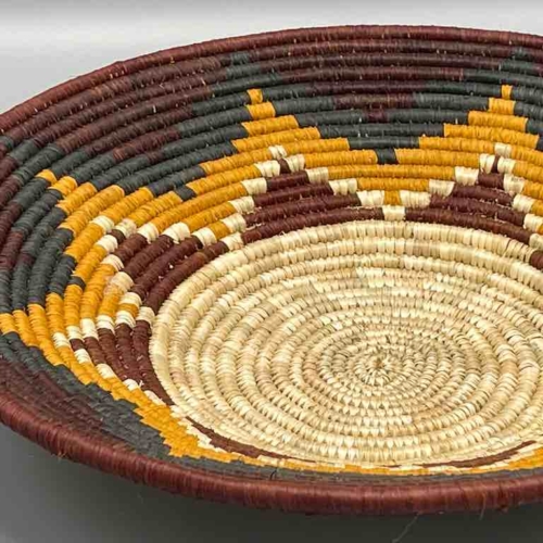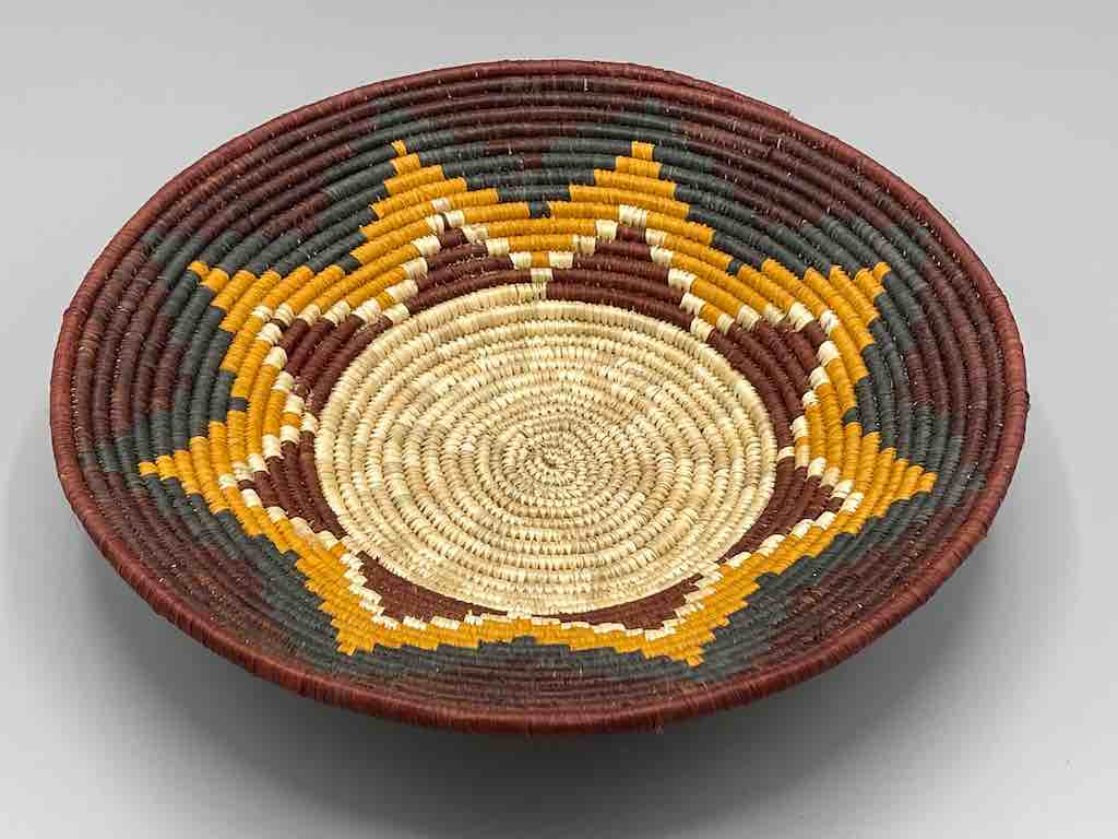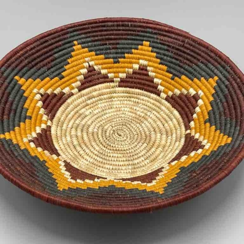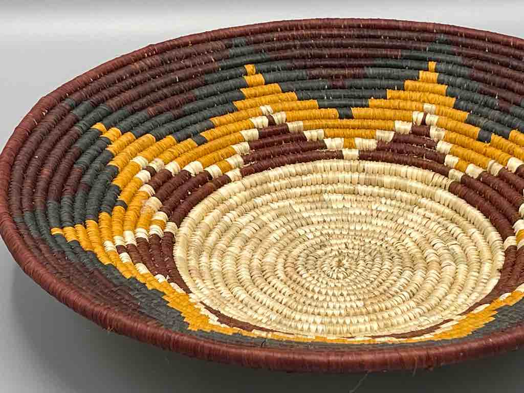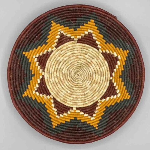 This basket/bowl is one of the thinnest coil and therefore finest quality woven basket in Africa. The design is among the most intricate, demonstrating the very advanced skill of the women of the Batoro tribe who make these in Uganda, near the Ruwenzori Mountains. This one is relatively small which affords the woman who made it to show off her exceptional basket weaving ability at a lower cost. We think these are the most beautiful and finest quality baskets we have ever seen, reflecting the unbelievable ingenuity of these amazing Ugandan artisans. Locally available natural dyes are used to create the vibrant colors which contribute to the beauty of these baskets This basket measures 10″ in diameter x 2 1/8″ deep (25 x 5 cm)
